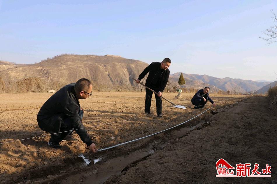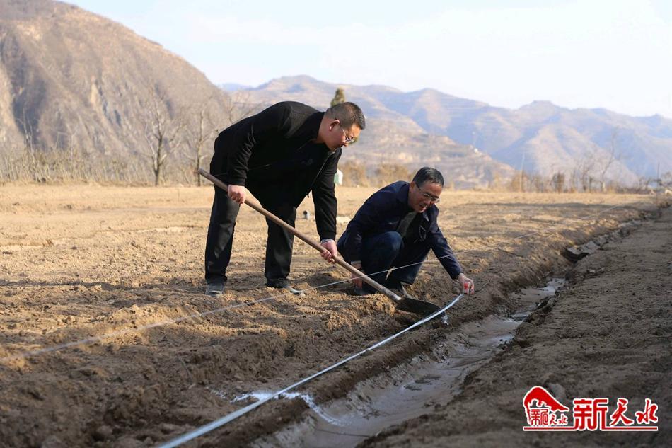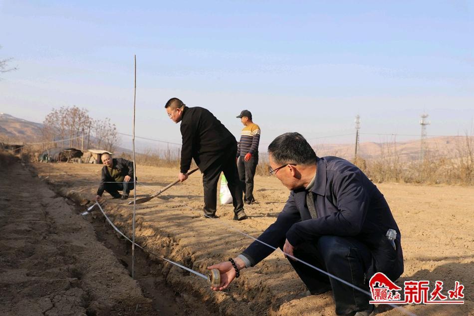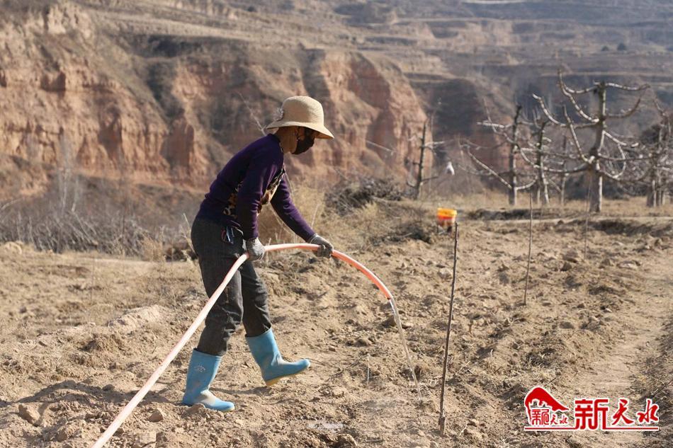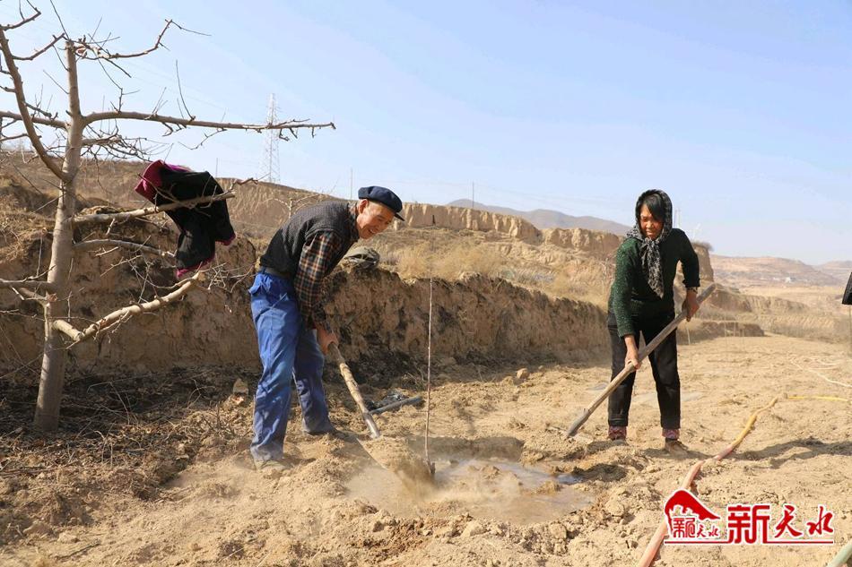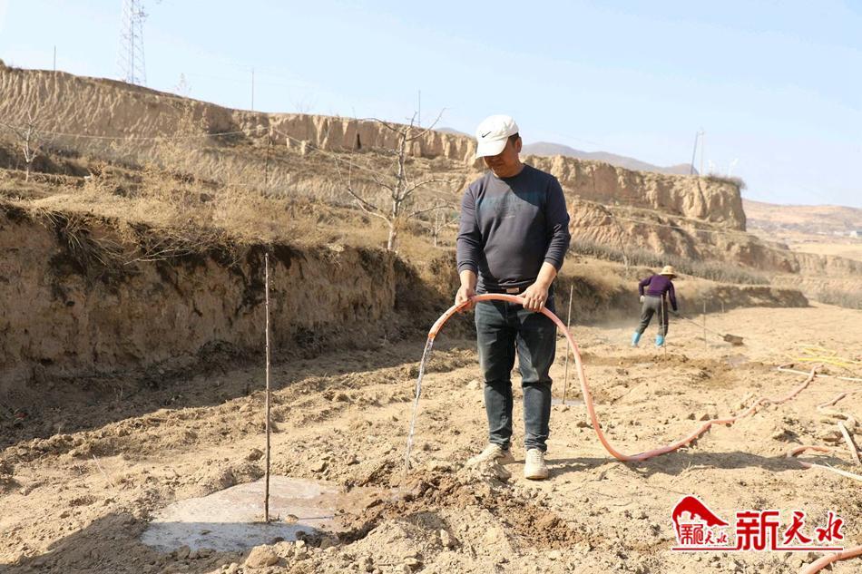新天水讯【特约通讯员郭永强 王正平】“最近天气比较干旱,一定要把水浇透,然后把黑膜及时铺上……”3月6日,在武山县润博果蔬专业合作社果园中,武山县果业发展中心主任张冬冬带领技术员对栽树人员进行技术指导。针对果树老化问题,今年该合作社申请老果园迭代更新改造项目,对100亩老旧苹果树进行改造,种植新品种大樱桃,让老果园焕发新生机。