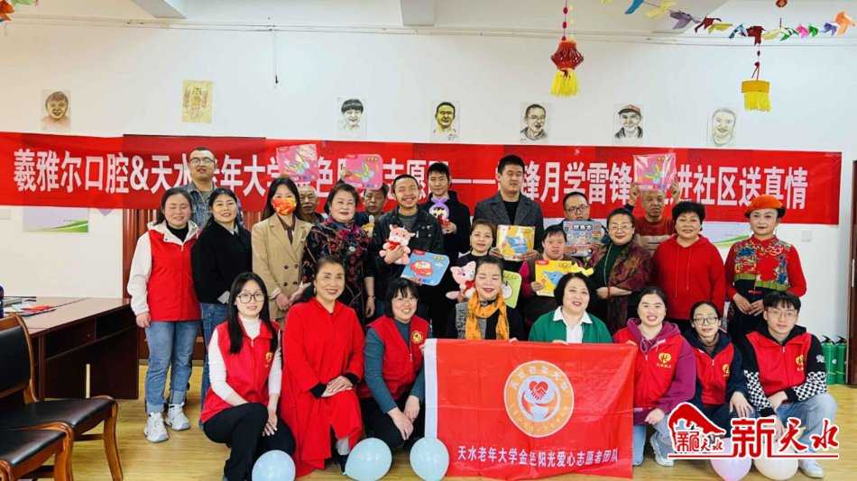 新天水讯 3月9日,天水老年大学金色阳光志愿者团队携手羲雅尔口腔医院,走进秦州区七里墩街道十里铺社区残疾人日间料理中心,举办了学雷锋情系残疾人活动。