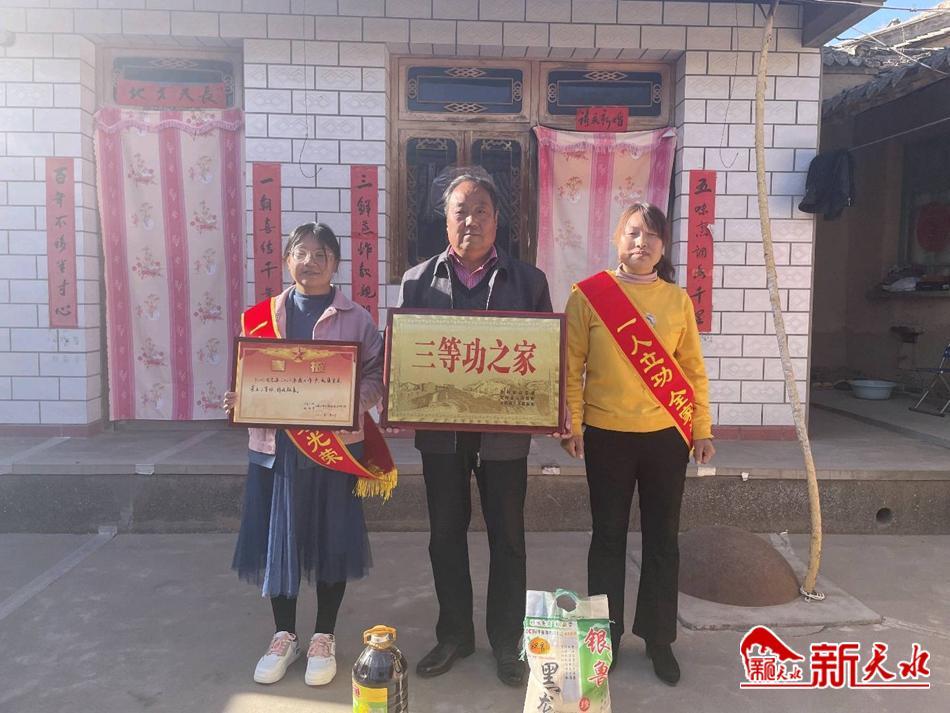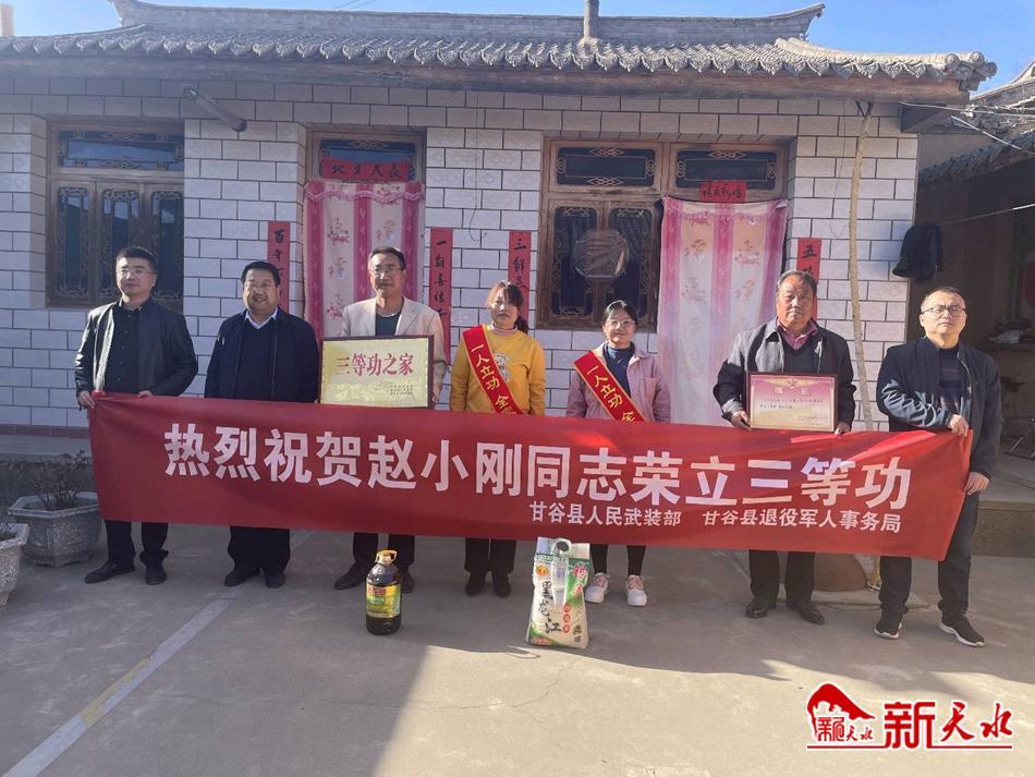 得知赵小刚荣立三等功,隔壁邻居纷纷赶来道贺,现场热闹非凡,甘谷县退役军人事务局工作人员在村民的欢呼和掌声中来到赵小刚家里,为军属送上“三等功之家”牌匾,披挂上“一人立功,全家光荣”绶带,将三等功喜报送到家属手中,并送上慰问金和慰问品。
