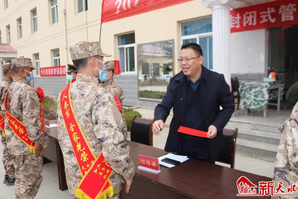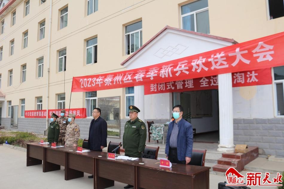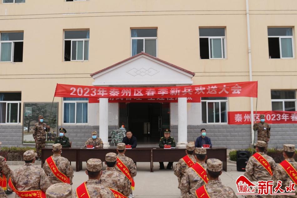 新天水讯【记者王莹 通讯员曹彤】阳春三月送新兵,秦州男儿赴征程。3月15日,秦州区举行2023年春季新兵入伍欢送大会,身着迷彩服、肩披红绶带的新兵们在军地领导的欢送下整装待发,准备启程奔赴火热军营。秦州区相关领导,区人武部、区退役军人事务局负责人、23镇(街道)主要领导以及专武干部、全体新兵参加会议。