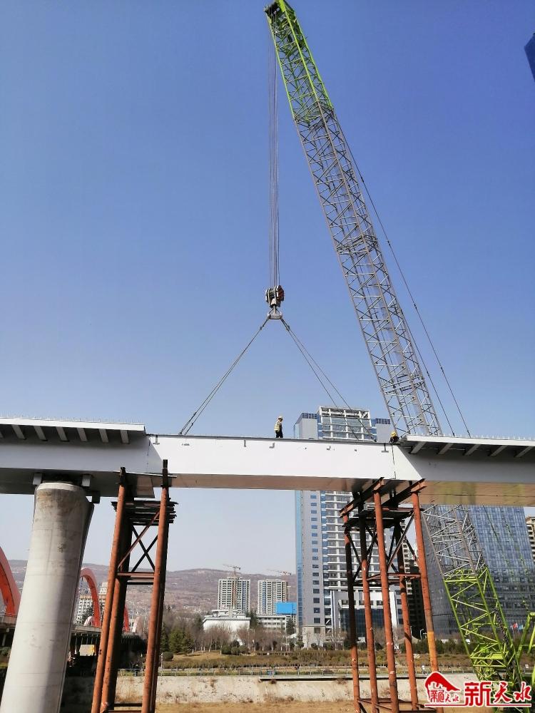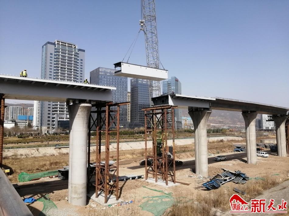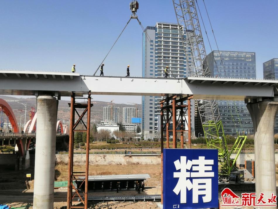 天水有轨电车藉河特大桥上跨迎宾桥钢箱梁主体结构架设完成