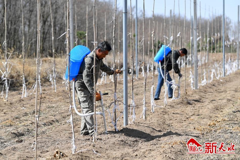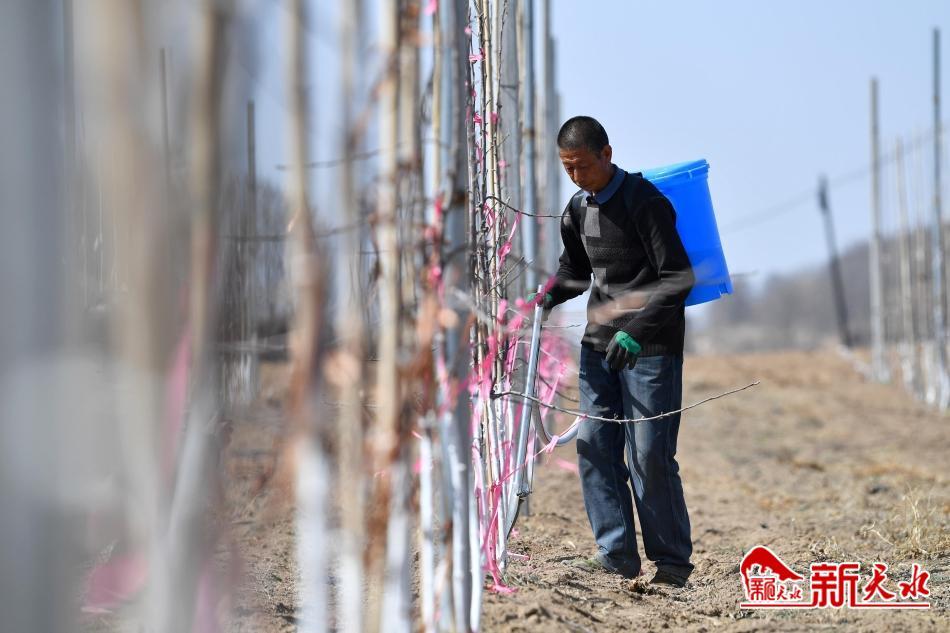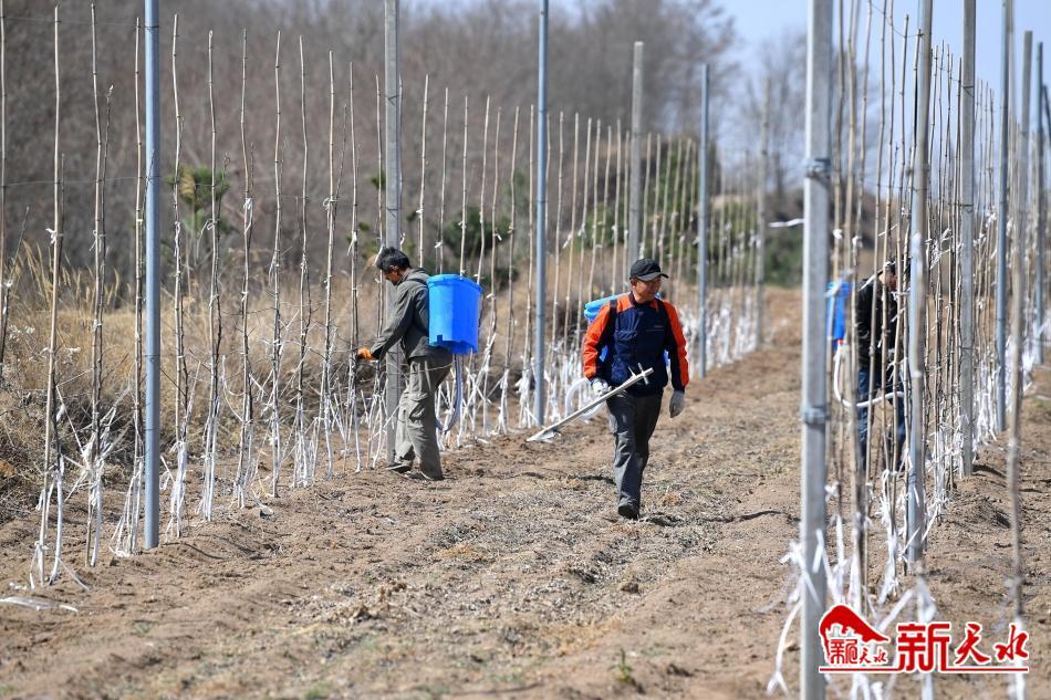 3月19日,农民正在清水县金集镇苹果矮砧密植栽培示范基地为果树施肥。为进一步推进高质量特色农业产业发展,加快果品产业迭代转型升级步伐,金集镇全力打造苹果矮砧密植栽培示范基地。据悉,该镇今年计划发展苹果矮砧密植栽培120亩,以形成果树及时换代、新老果园互补、品质持续改善、规模不断壮大、效益稳步提升的良好发展格局,进一步带动群众增收致富。