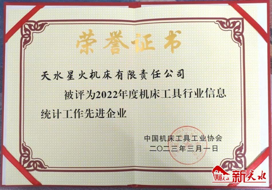 新天水讯 日前,中国机床工具工业协会授予天水星火机床公司“2022年度机床工具行业信息统计工作先进企业”荣誉称号。