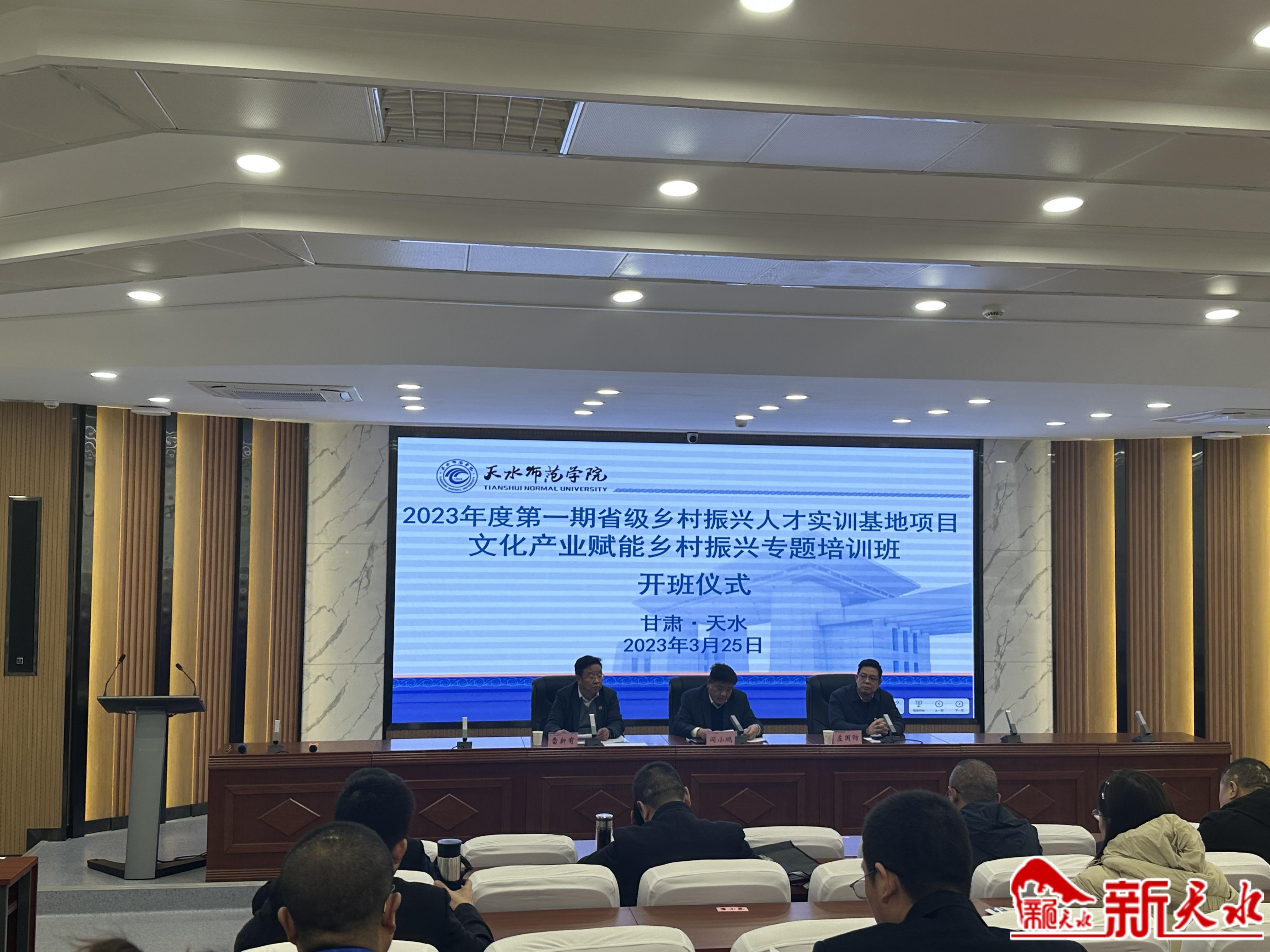 新天水讯【记者辛闻】3月25日上午,省级乡村振兴人才实训基地项目——文化产业赋能乡村振兴专题培训班开班仪式在天水师范学院举行。天水、陇南两市宣传和社科联部门负责人,省、市社科基地负责人,优秀文艺工作者,文旅企业及县区旅游示范乡镇负责人共计90多人参加培训。