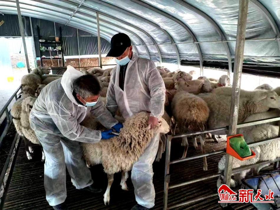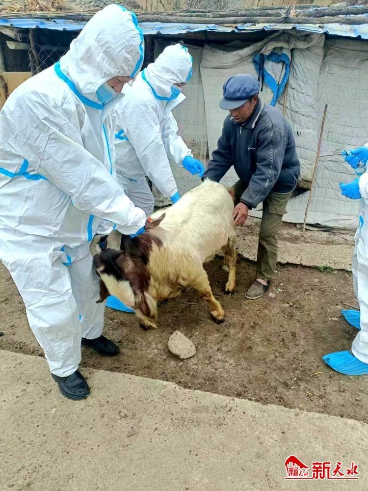 3月23日,秦州区皂郊镇榆林村,来自秦州区畜牧兽医事务服务中心和皂郊镇畜牧兽医站的防疫人员正在给该村的羊养殖户郑昌辉养殖的羊注射疫苗。