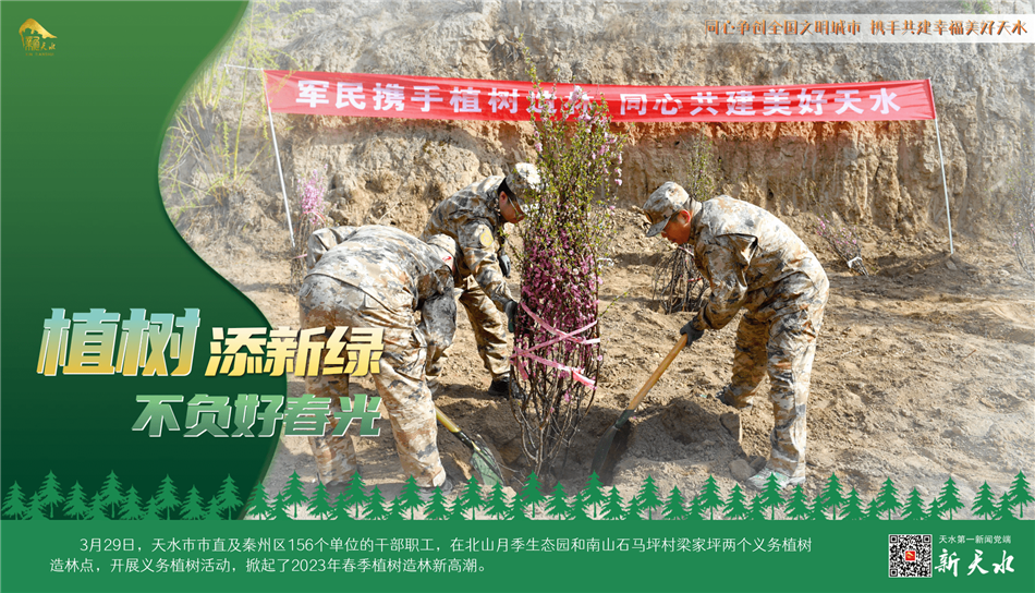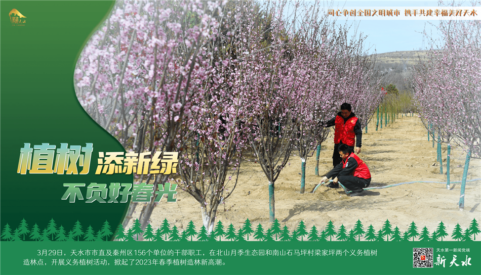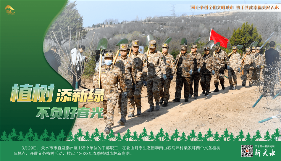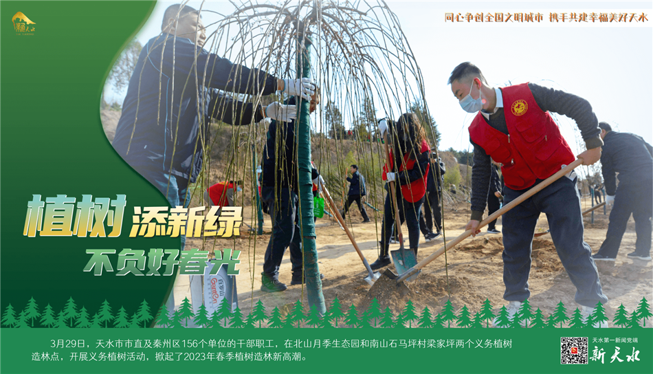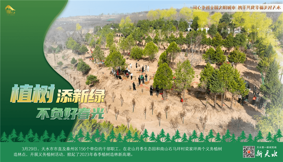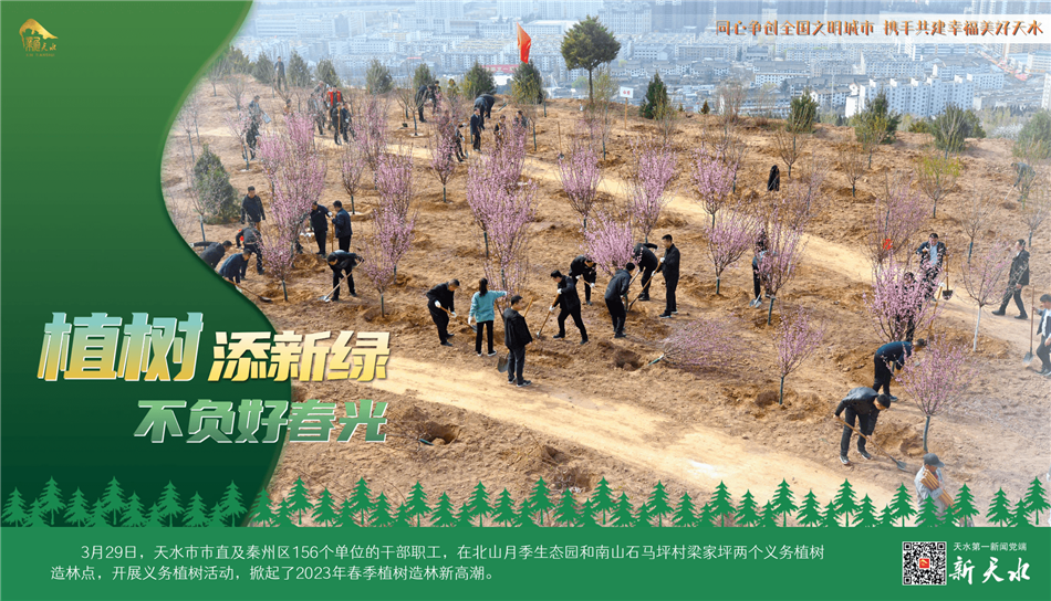 阳春三月,春风吐绿,草木初荫,正是植树绿化好时节。3月29日,天水市市直及秦州区156个单位的干部职工,在北山月季生态园和南山石马坪村梁家坪两个义务植树造林点,开展义务植树活动,掀起了2023年春季植树造林新高潮。