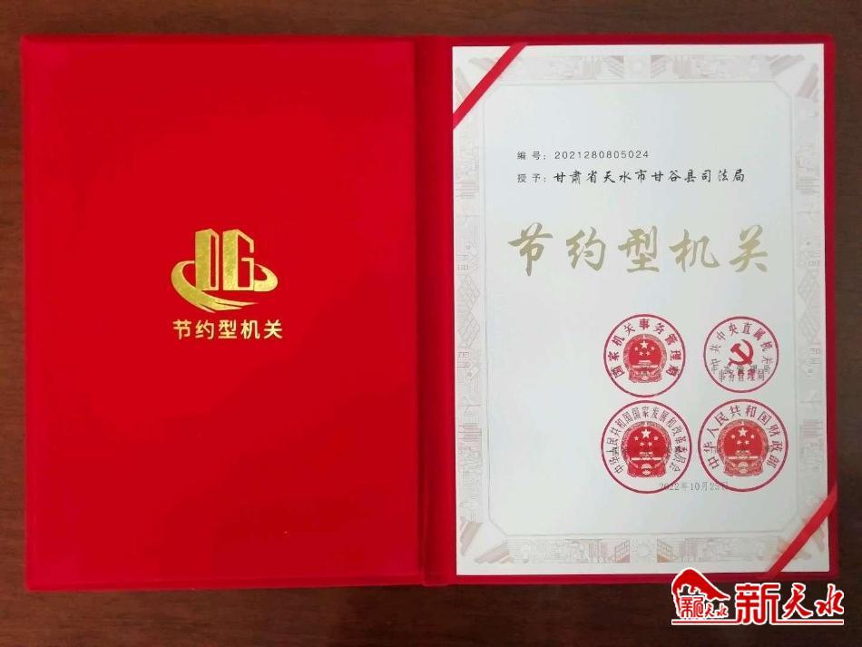 新天水讯 近日,笔者从有关部门获悉,甘谷县司法局荣获全国“节约型机关”荣誉称号。
