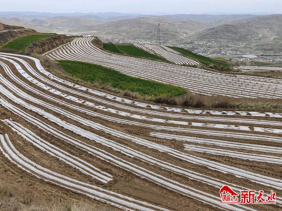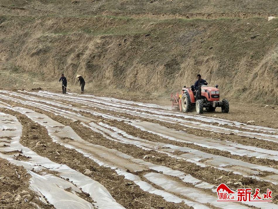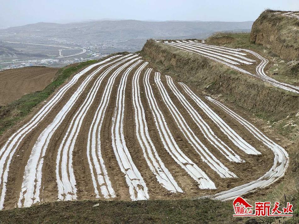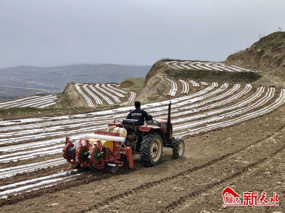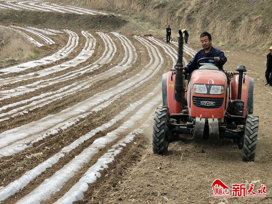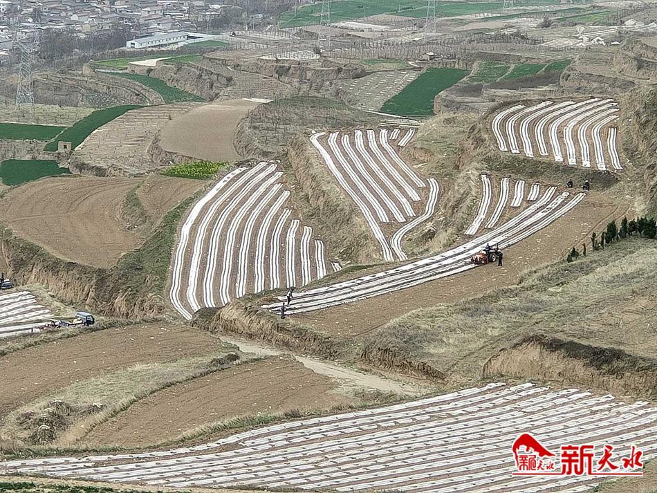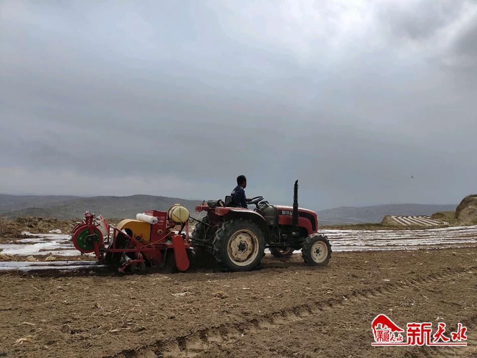 新天水讯 4月10日,秦州区天水镇天水村村民杨保安驾驶拖拉机在焦李北山给万肃农民种植专业合作社的大豆玉米带状复合种植覆膜,而这样的情景在全镇22个种植点同时上映。