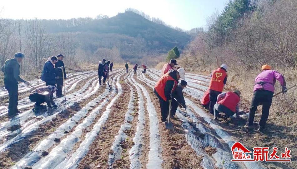 4月11日,在清水县远门镇梨林村金银花种植基地,村民正在补栽金银花苗,现场一派繁忙景象。
