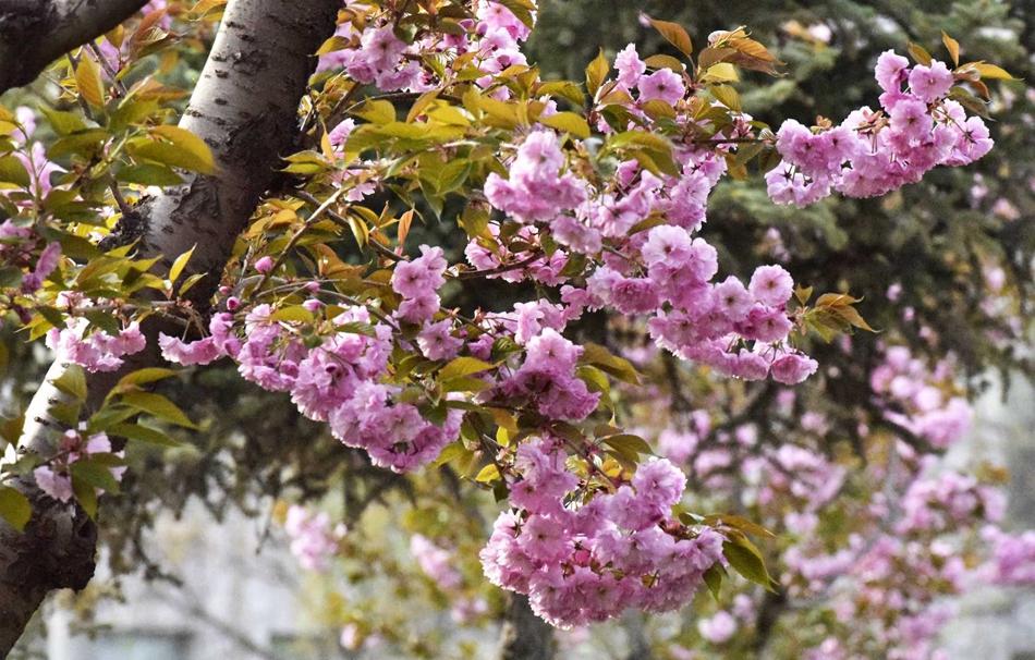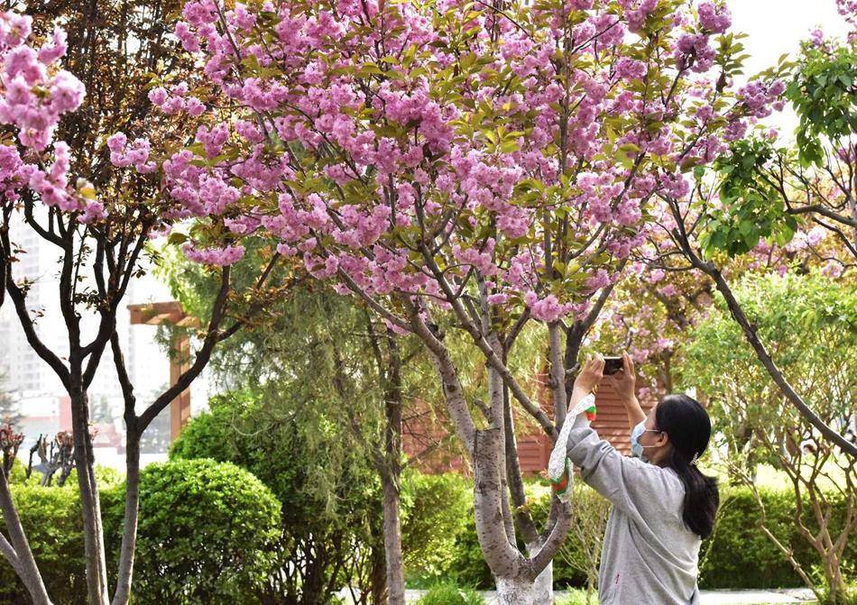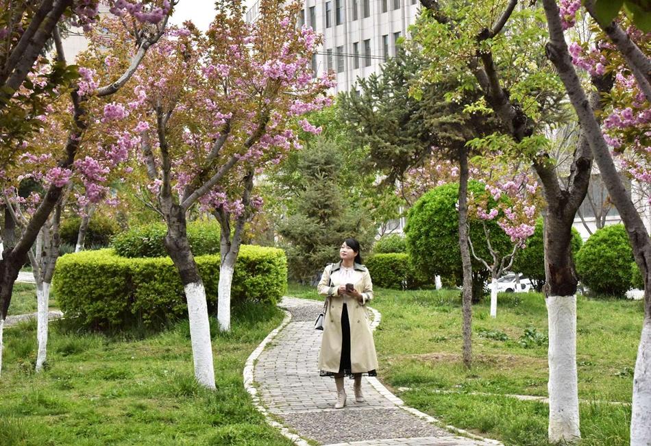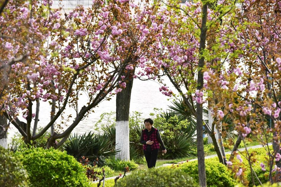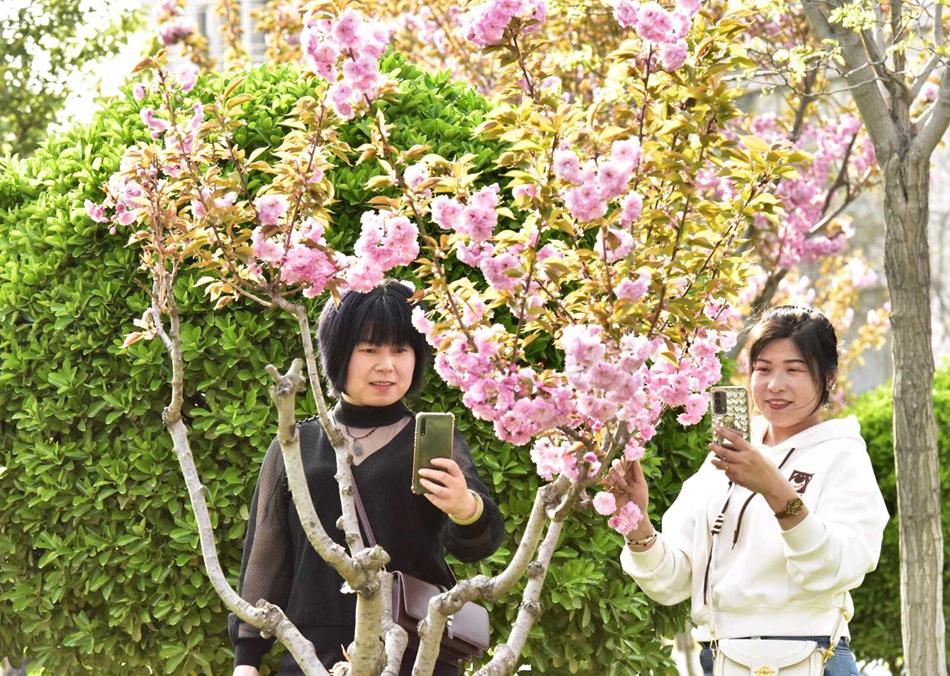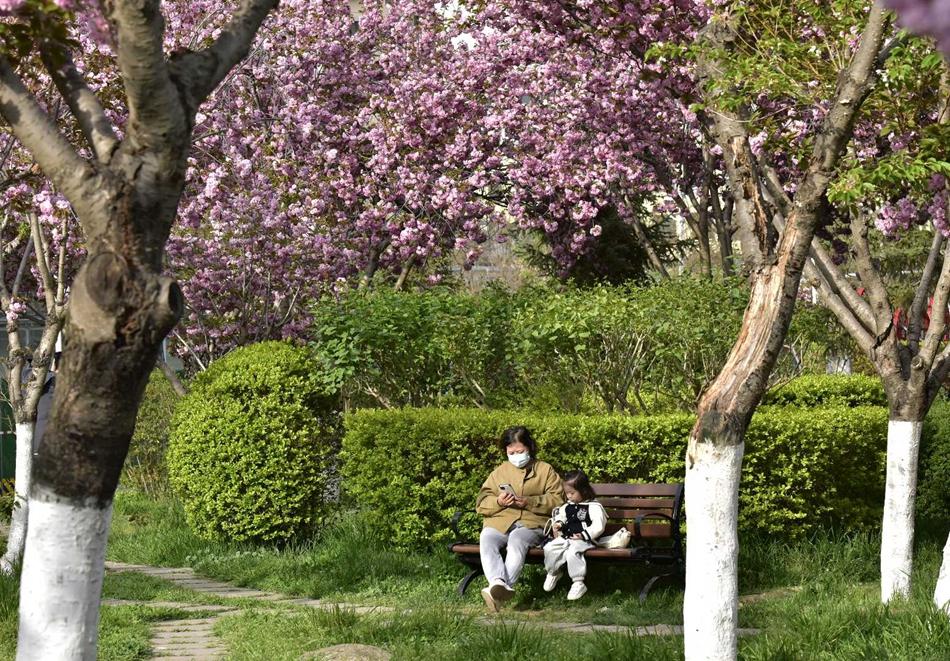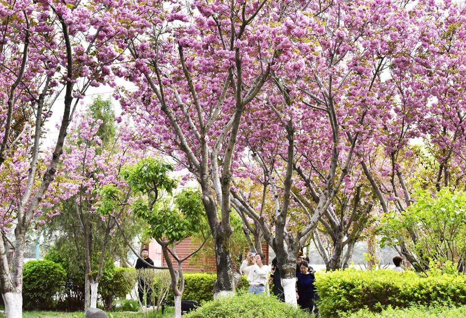 近日,天水樱花次第开放,美景如画,吸引不少市民前来赏花打卡,拍照留念。图为4月13日,市民在天水樱花园赏花游玩。