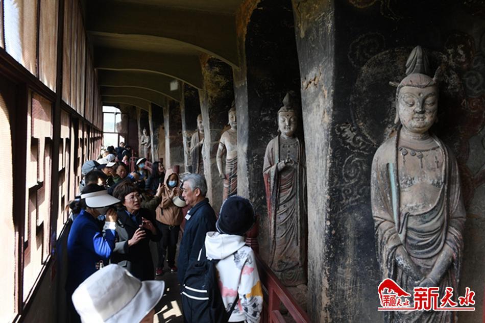 麦积山石窟始建于十六国后秦,现保存窟龛221个,泥塑、石刻7800多件,壁画1000多平方米,生动展现了当时的雕塑、绘画、建筑水平和艺术文化造诣。来宾们登上麦积山石窟,边听讲解边参观,近距离对话这座“东方雕塑陈列馆”。
