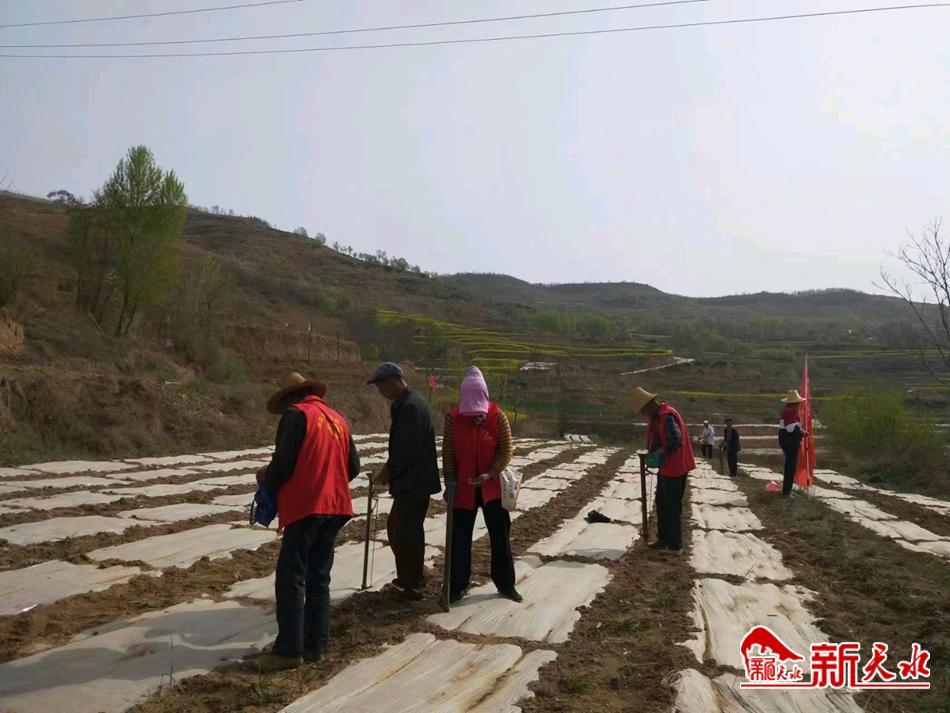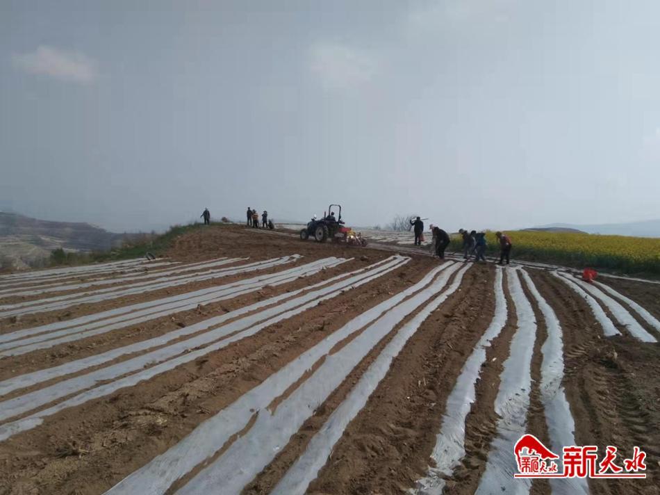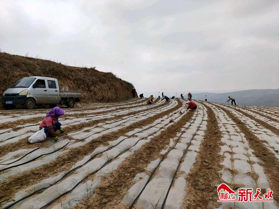 新天水讯 最美四月天,站在武山县四门镇北山,放眼望去,一排排整齐有序的覆膜垄沟,在千亩架豆种植示范点,显得格外靓丽,村民们在田间忙着点播架豆,一派繁忙。