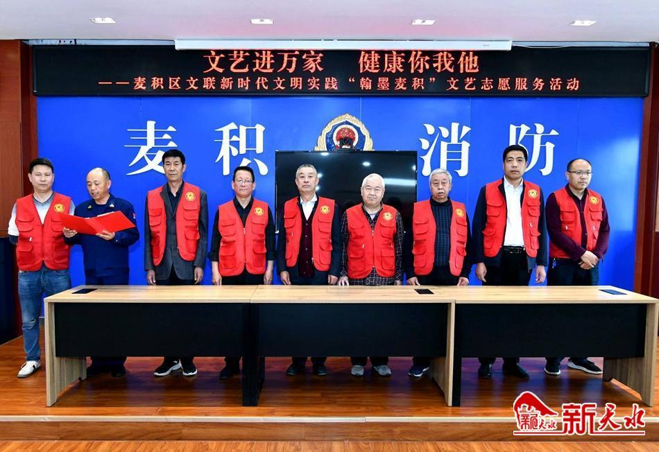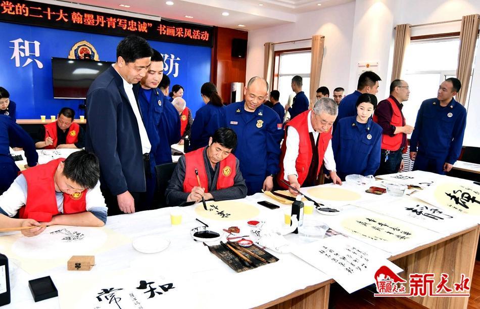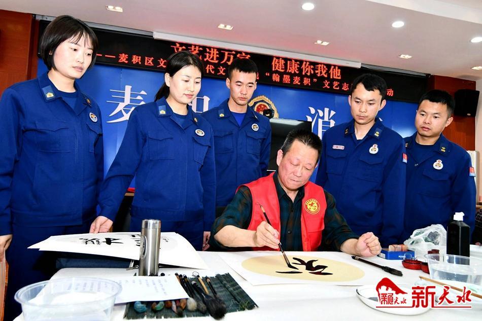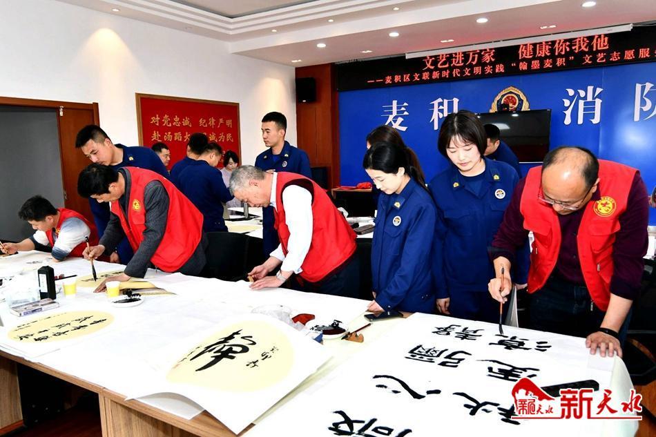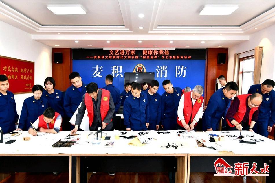 新天水讯【特约通讯员窦耀辉】翰墨飘香,丹青溢彩。4月18日,麦积区文联组织部分书画艺术家走进麦积消防救援大队,开展以“文艺进万家,健康你我他”为主题的新时代文明实践“翰墨麦积”文艺志愿服务活动暨“践行党的二十大,翰墨丹青写忠诚”主题书画笔会。旨在大力弘扬中华民族优秀传统文化,丰富新时代文明实践活动载体,为消防救援指战员送去了一道丰盛的“文化大餐”,同时把党组织结对共建活动和“三抓三促”行动引向深入。