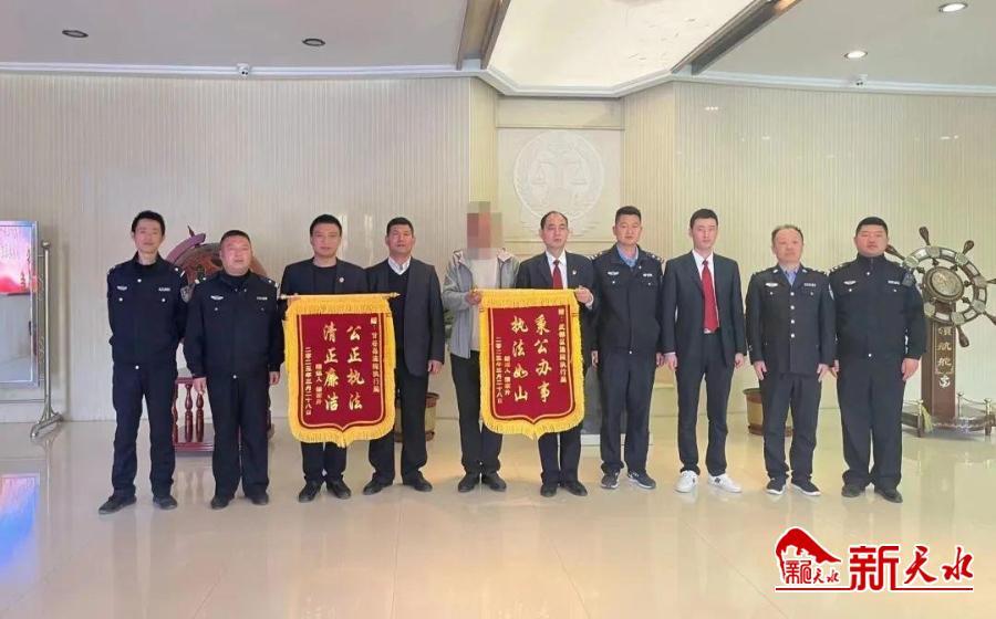 新天水讯【记者蔚军平】近日,申请执行人蒲某从陇南市礼县专程来到甘谷法院,将一面写有“公正执法、清正廉洁”的锦旗送到到法院执行局工作人员手中,感谢法院与武都区人民法院紧密协作联动执行,成功执结了一起长达三年的租赁合同纠纷案件。
