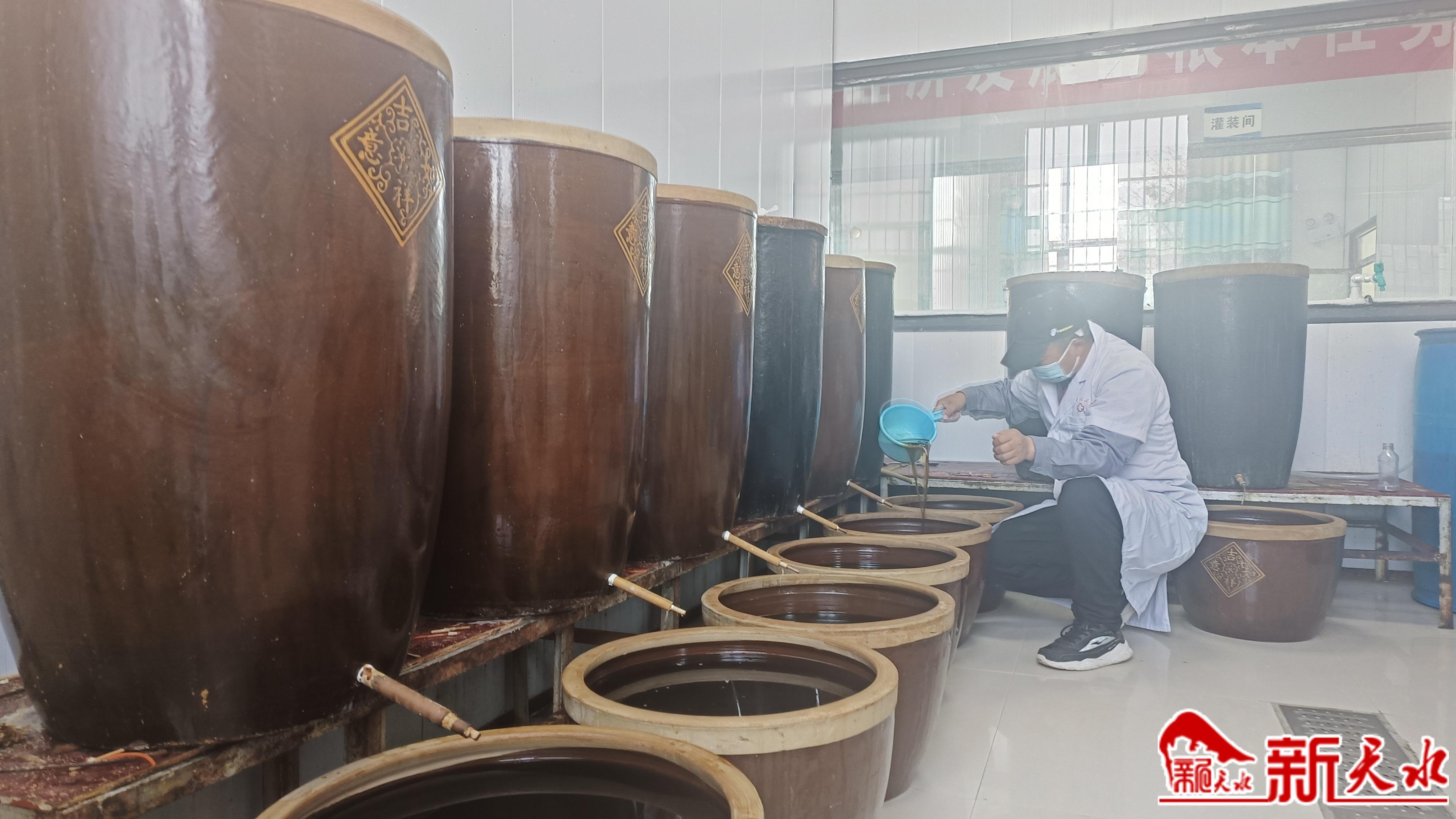 4月19日,记者来到四门村集体经济发展项目食醋作坊时,工人们正在发酵车间翻拌酿醋材料,在另一间房子里,十几口大缸整齐排列,滴滴香醋正沿着竹棍顺流而出,整个车间醋香弥漫。