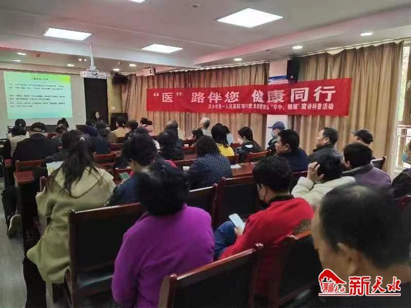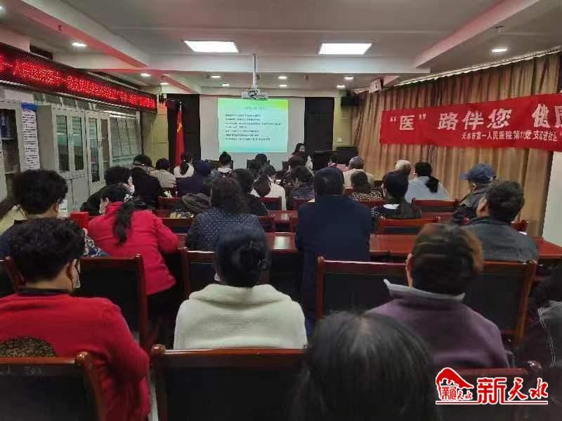 健康讲座中,天水市第一人民医院神经内一科医生用通俗易懂的语言,向辖区居民讲述了“卒中、睡眠”疾病的预防、治疗、康复的知识,医院党支部利用所在科室专业技术优势,深入社区,为群众进行“脑卒中”、“睡眠障碍”等相关疾病的预防、治疗及康复做宣讲及指导。并对糖尿病、高血压等疾病的发病原因、危害、并发症、相关表现、如何监测等知识点,以糖尿病视网膜、糖尿病足等病变为切入点,图文并茂、生动形象的为社区居民上了一堂健康教育课,使居民对糖尿病的危害和预防有了进一步的认识,提高了他们对糖尿病的预防和应对能力。医护人员还将关系到居民切身利益事项进行现场答疑,对相关政策进行了宣讲。