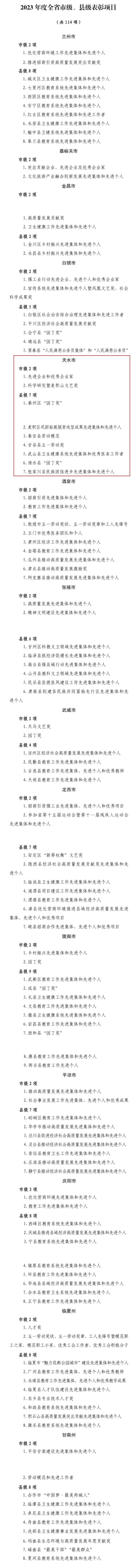 2023年度全省市、县级评比达标表彰项目公示!天水共9项入选
