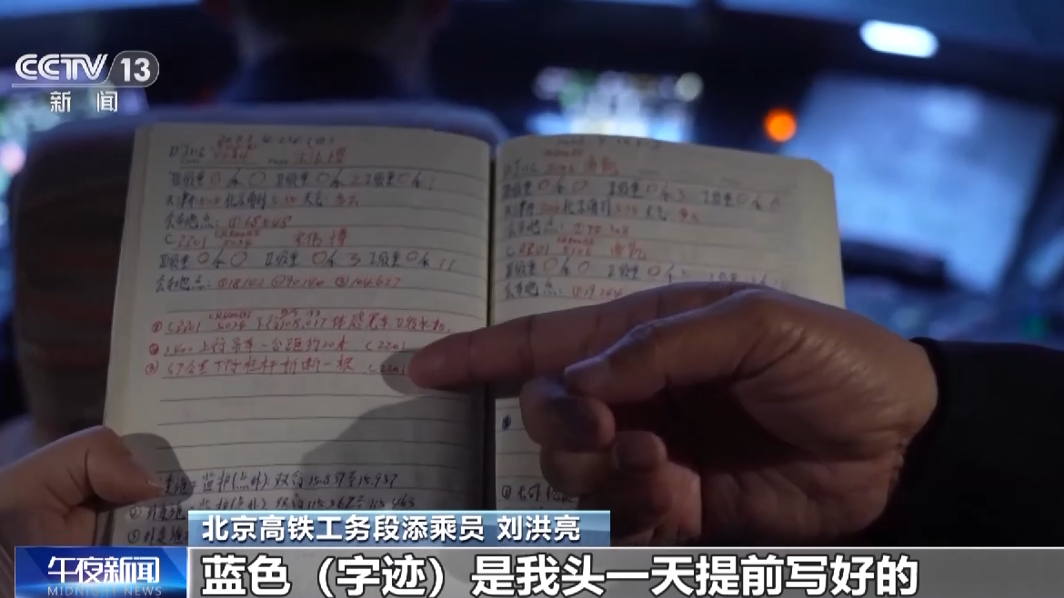 北京高铁工务段添乘员 刘洪亮:从干添乘开始记,有38本了。蓝色字迹是我头一天提前写好的,红色字迹是当天临时根据情况,然后进行的填写,这样可以一目了然。