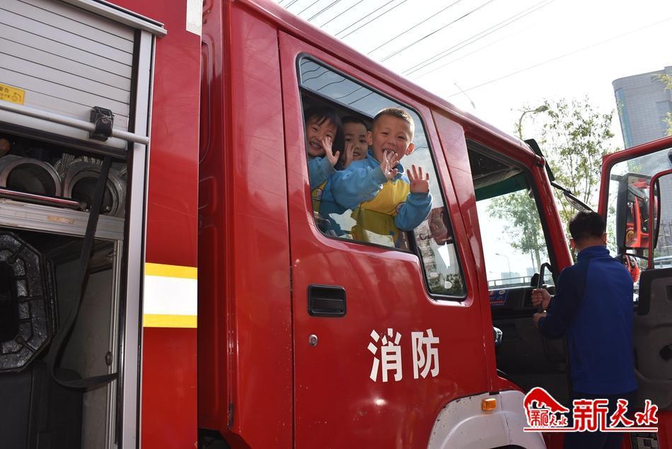 在车库前,一辆辆红色消防车整齐排列,消防宣传员依次为小朋友们介绍每辆车的名称和功能用途,还邀请小朋友上车乘坐,“零距离”体验一把,小朋友们个个兴高采烈坐上消防车并和消防车合影留念。