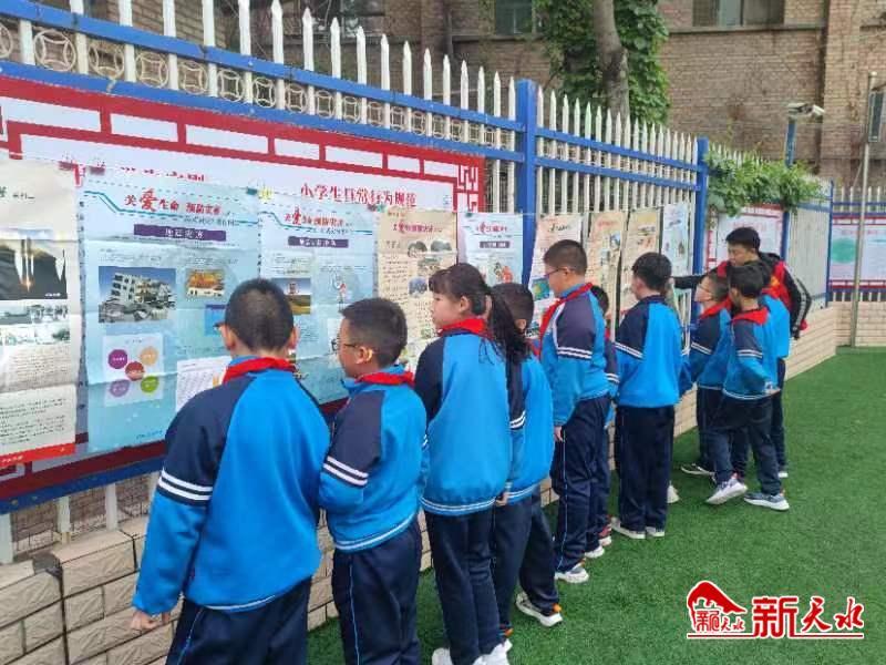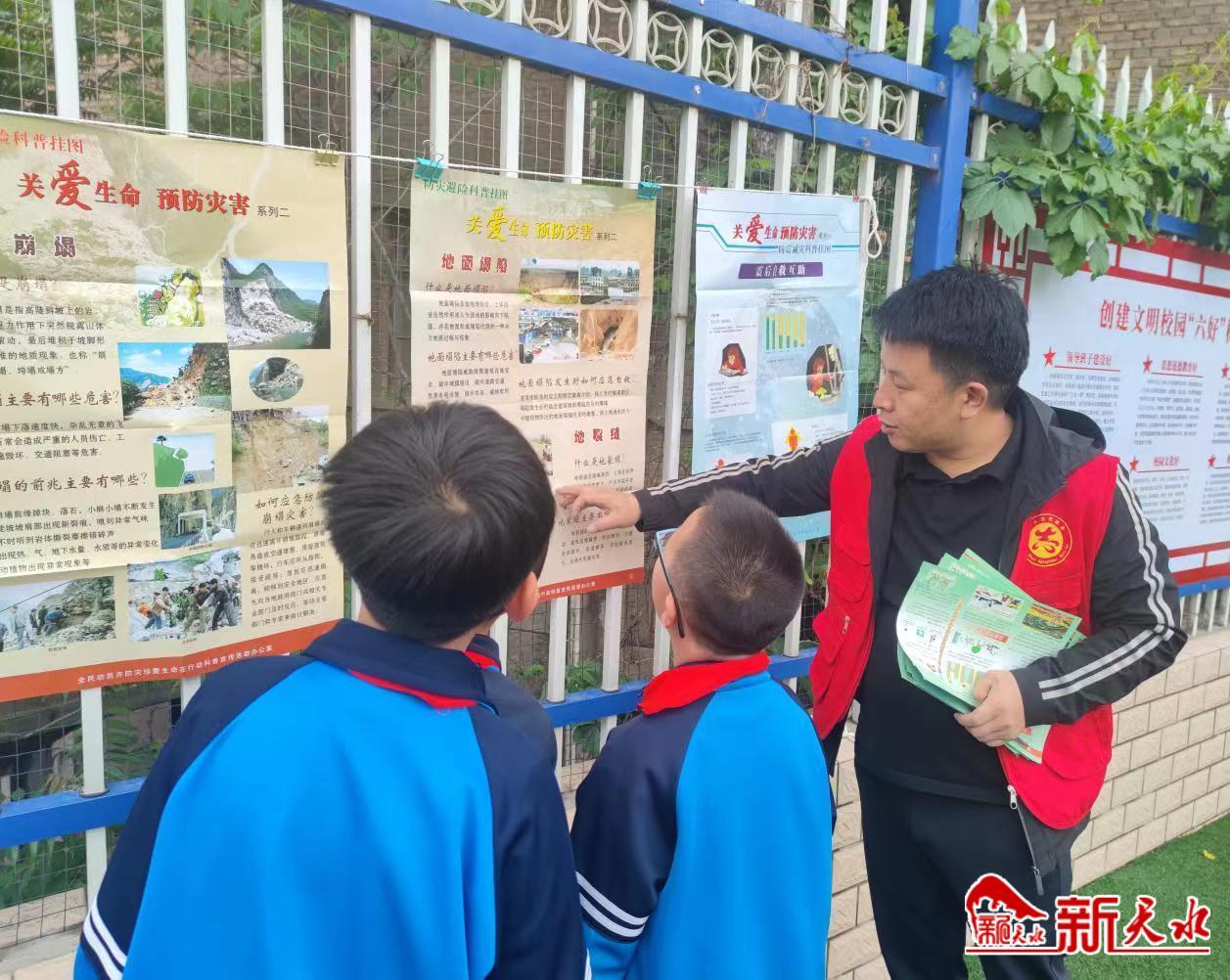 社区志愿者在学校操场,通过挂画、横幅、展板,对师生讲解了地球的构造、地震起因与危害、如何应对地震灾害以及洪涝灾害的成因及类型等科普知识,让师生们掌握基本的自救自护能力。