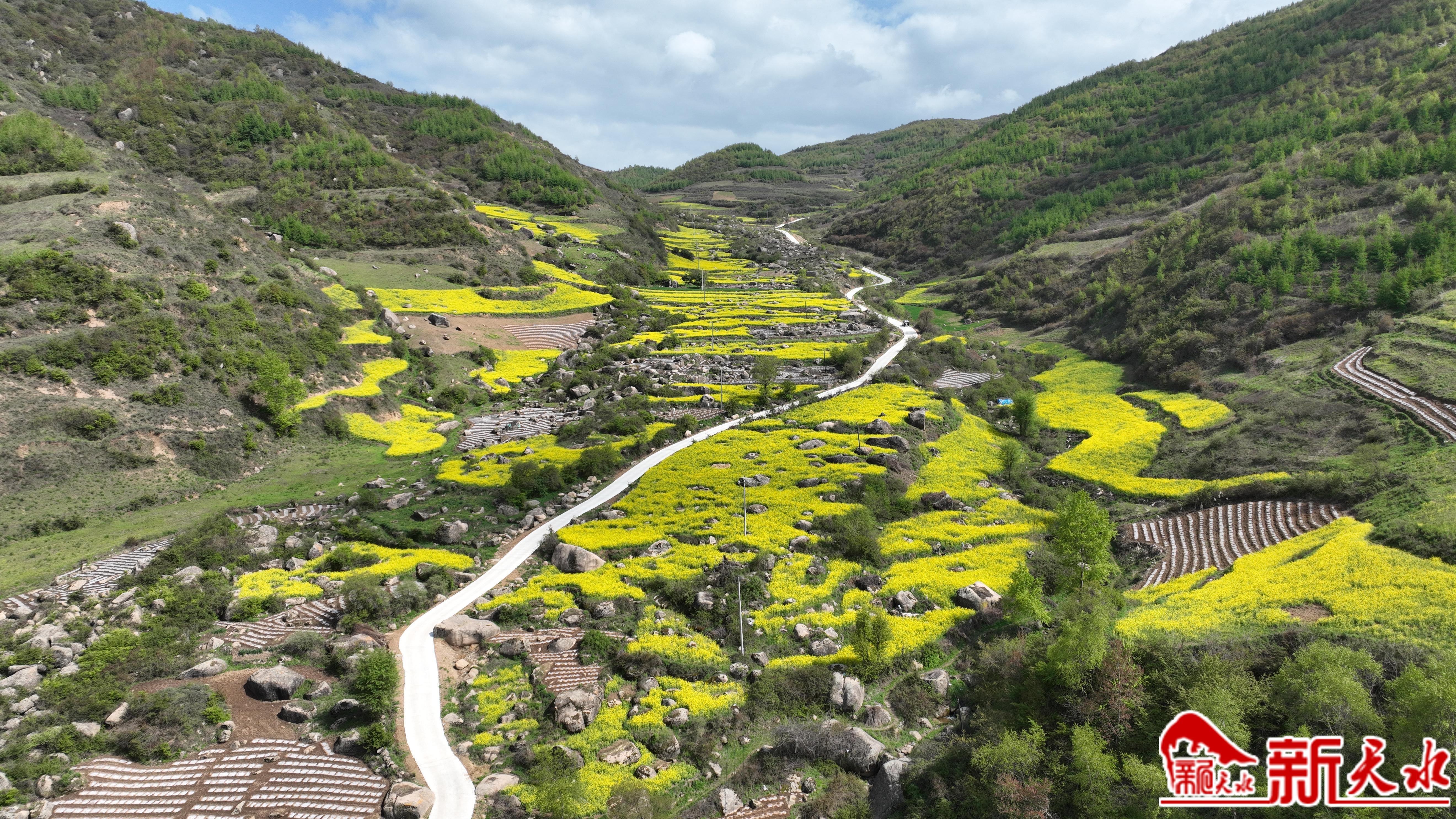 5月22日,记者一行来到位于四门镇松树村宽川子自然组后山的“天石列阵”景观所在地,金黄色的油菜花海随地形分布于梯田中,大小不一的巨石错落有致,蓝天白云下缤纷的色彩宛如油画一般,令人心旷神怡。