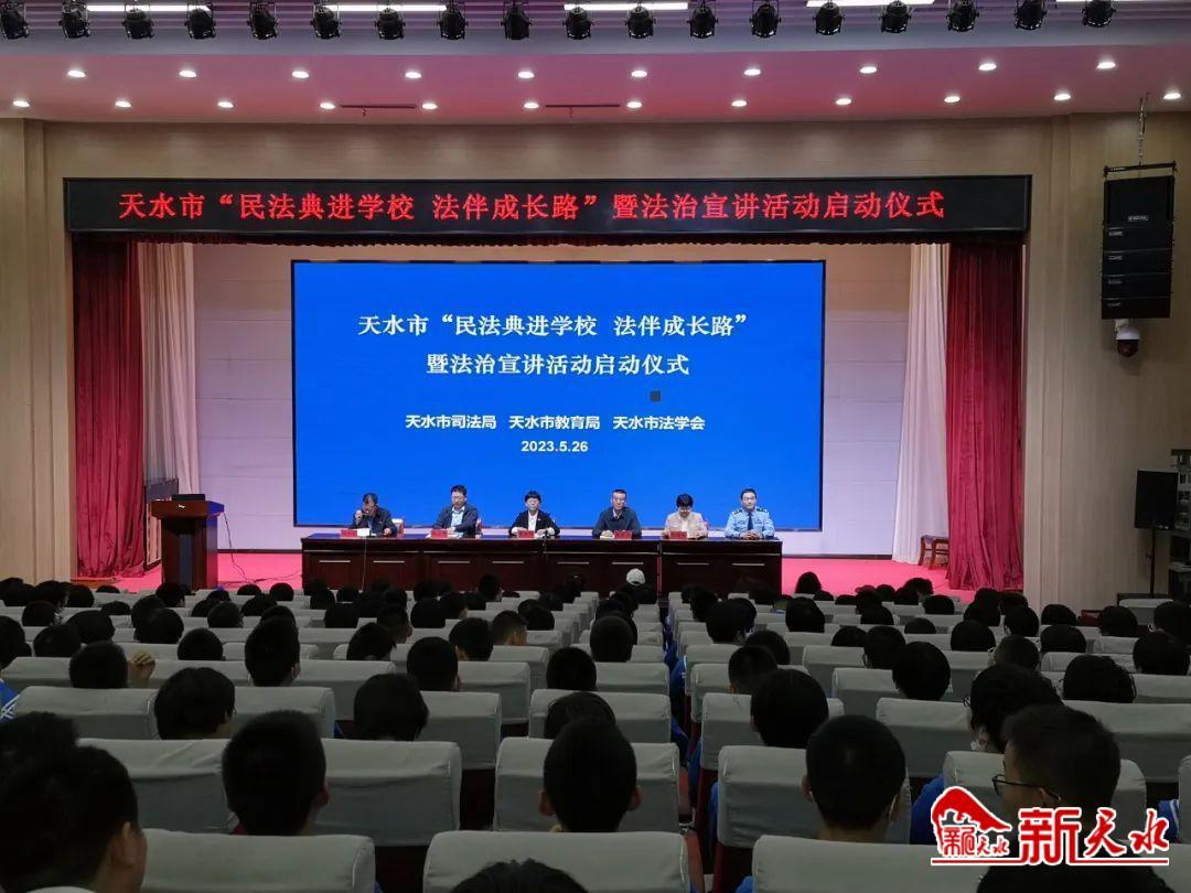 新天水讯【记者王晓华】5月26日,我市举办“民法典进学校·法伴成长路”暨法治宣讲启动活动。天水师范学院青年普法志愿者、天水市逸夫实验中学师生共500余人参加了活动。