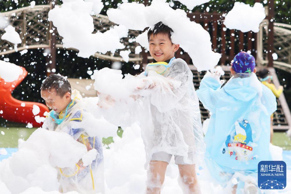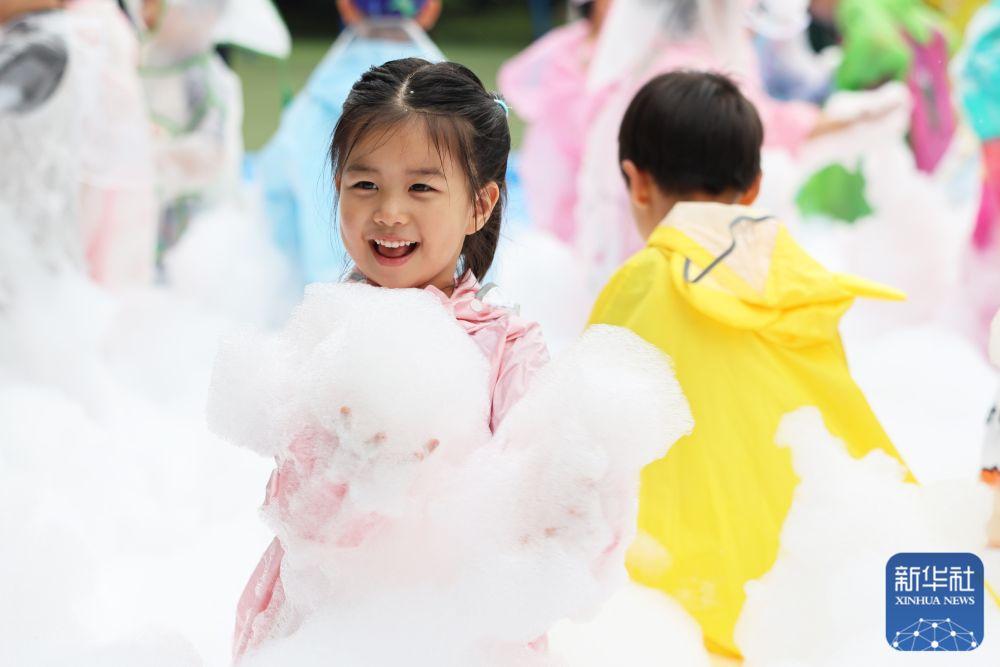 5月31日,在南京市金陵华兴实验幼儿园,小朋友们在“泡泡派对”上玩耍。新华社发(苏阳 摄)