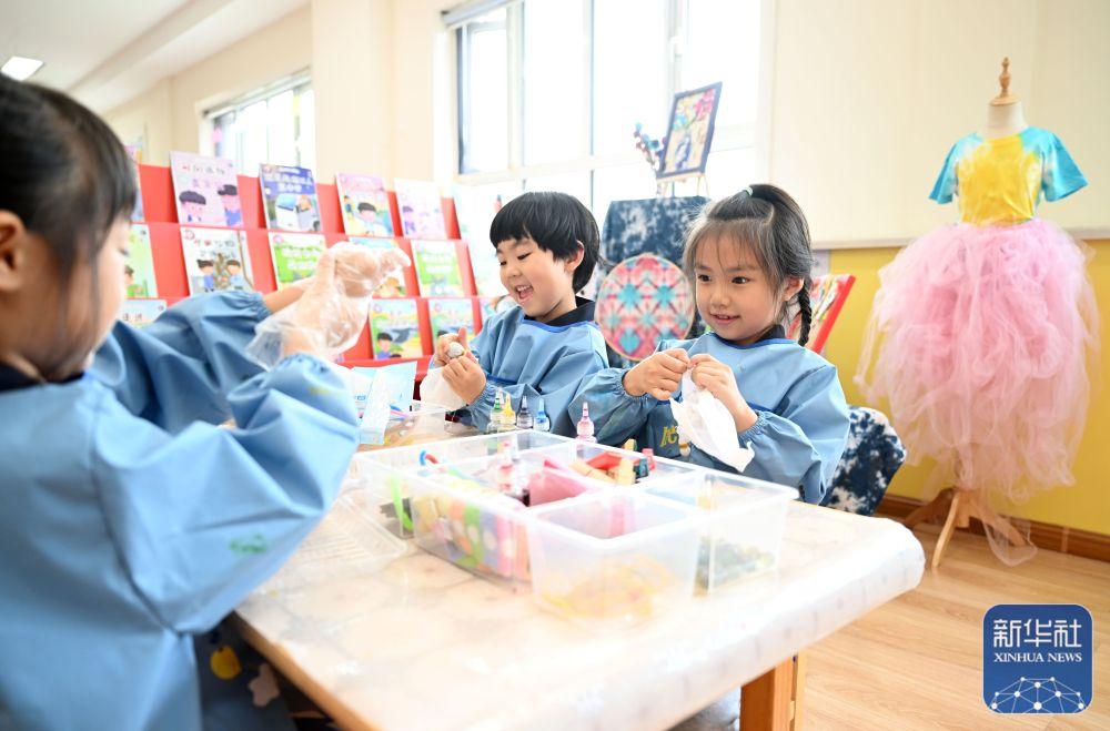 5月31日,在天津市和平区第五幼儿园,小朋友学习制作扎染。新华社记者 赵子硕 摄