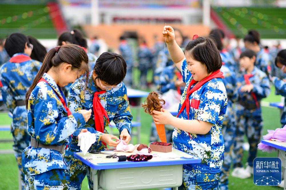 5月31日,内蒙古鄂尔多斯市鄂托克前旗第四小学学生在“我劳动 我快乐”主题活动中制作玩具。新华社发(王正摄)
