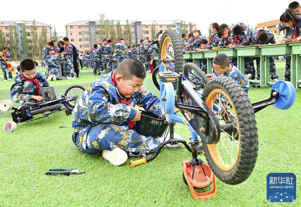 5月31日,内蒙古鄂尔多斯市鄂托克前旗第四小学学生在“我劳动 我快乐”主题活动中修理自行车。新华社发(王正摄)
