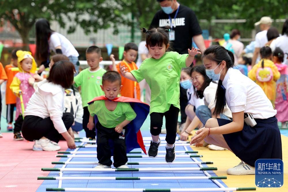 5月31日,在合肥市长江东大街幼儿园举办的“萌娃迎六一”活动中,小朋友参加趣味推车游戏。新华社发(解琛摄)