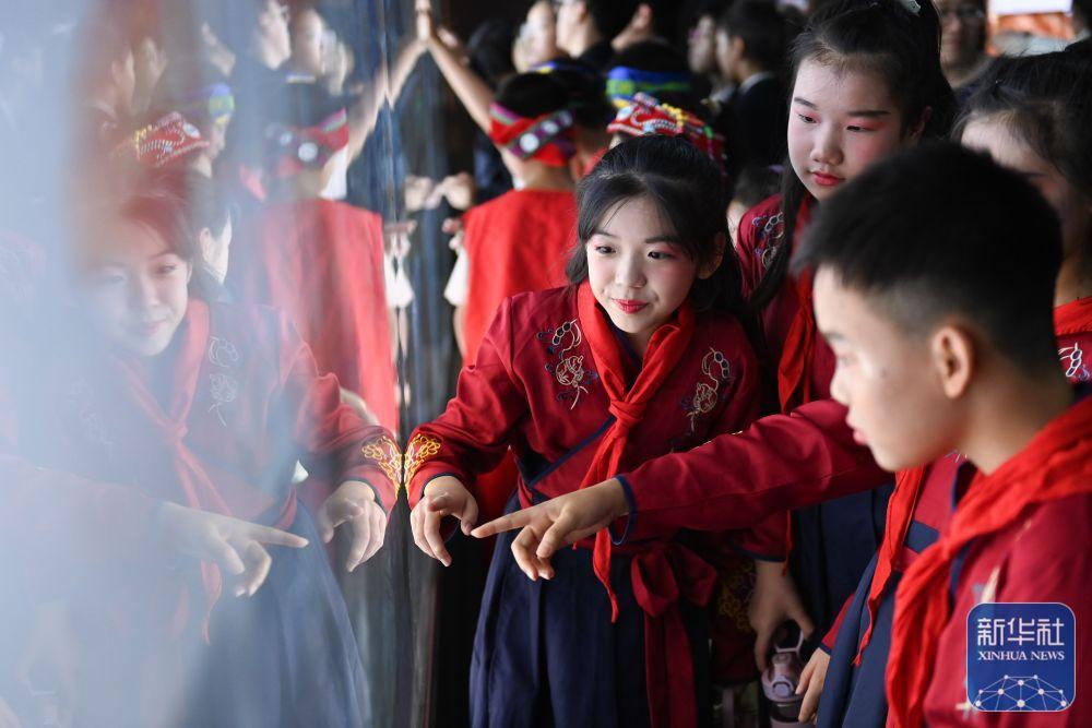 5月31日,在浙江省湖州市吴兴区八里店镇潞村“典籍里的中国”陈列馆,参加“诵读国学经典 传承华夏气韵”主题活动的小学生体验展厅的互动环节。新华社记者 黄宗治 摄