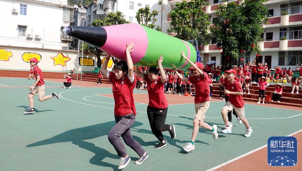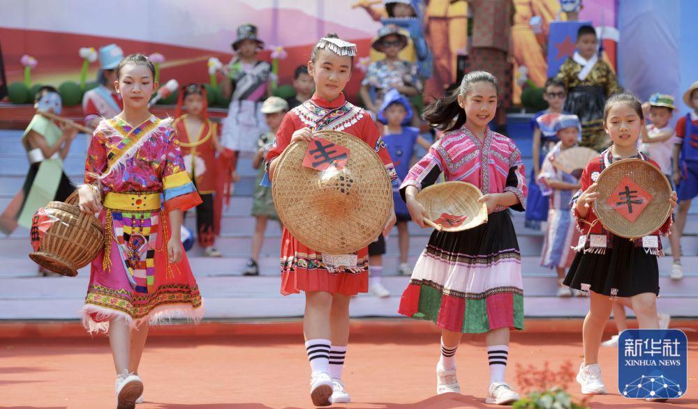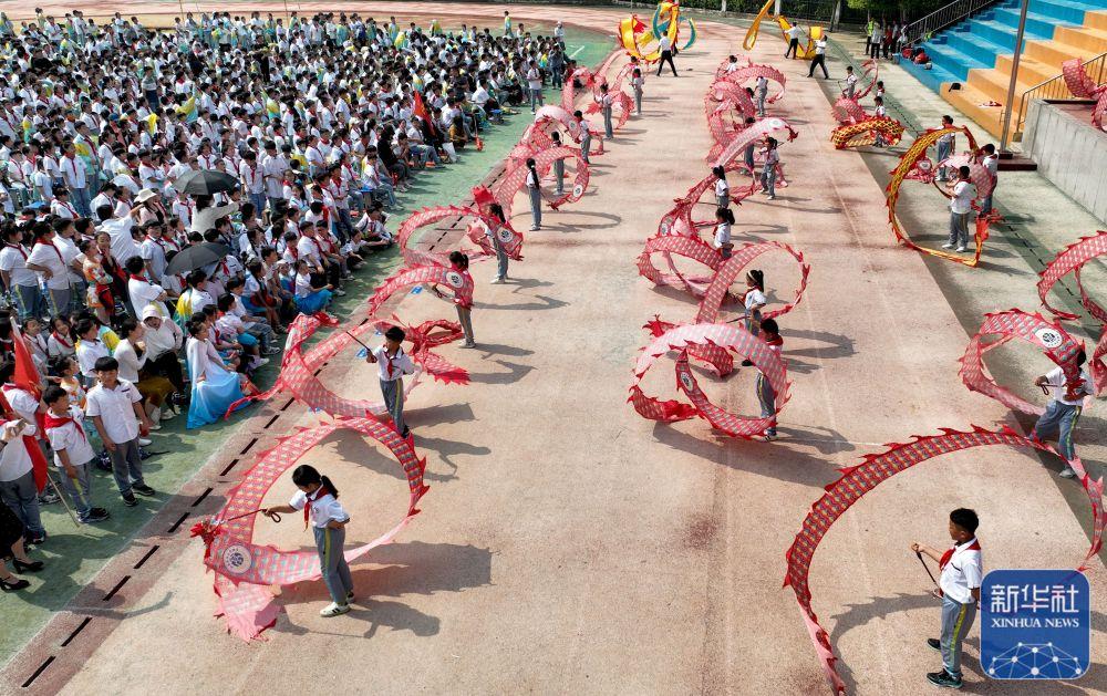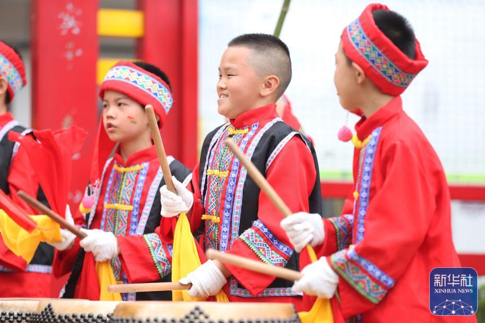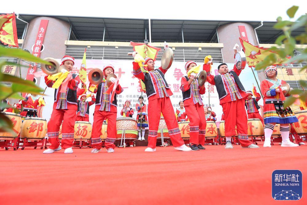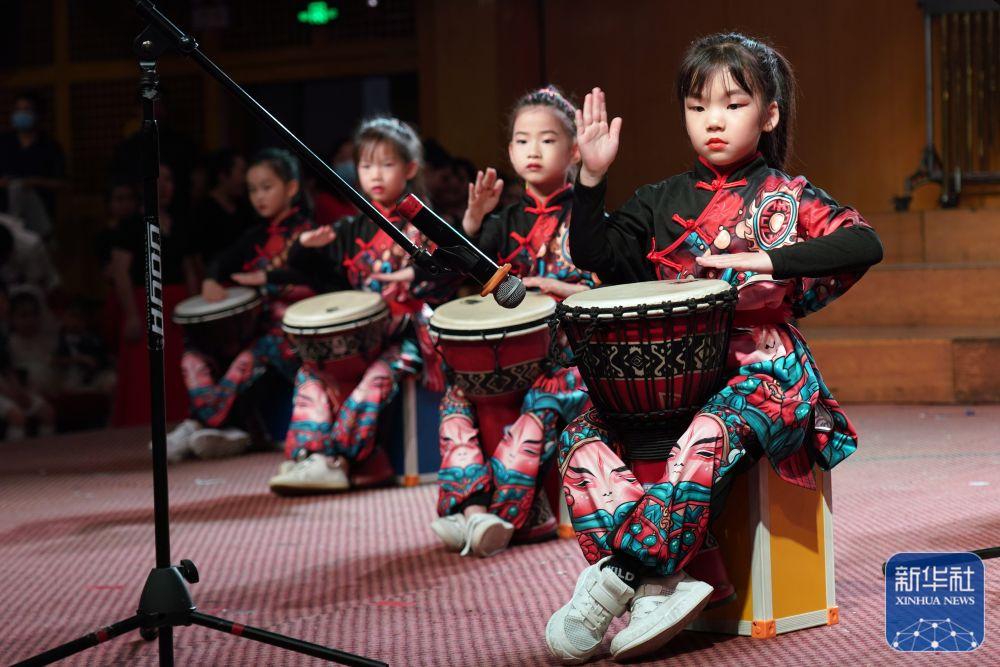 5月31日,在贵州省岑巩县思旸镇第一小学,学生在文艺汇演中表演“非遗战鼓”节目。新华社发(唐鹏摄)
