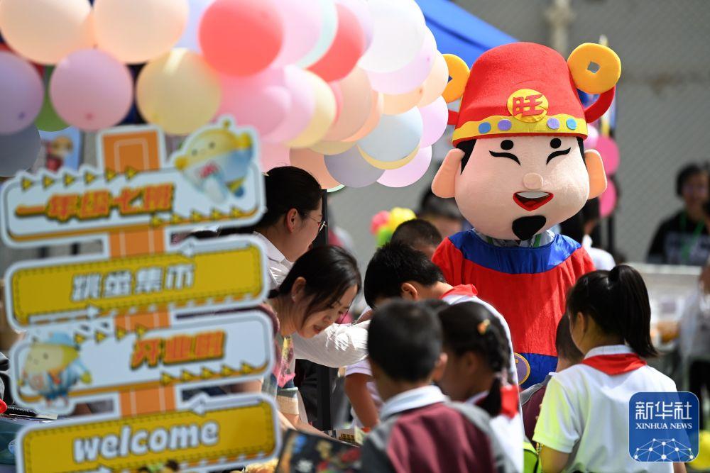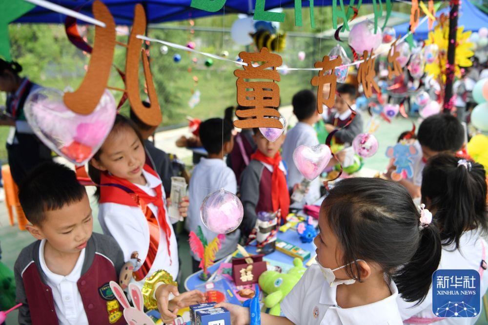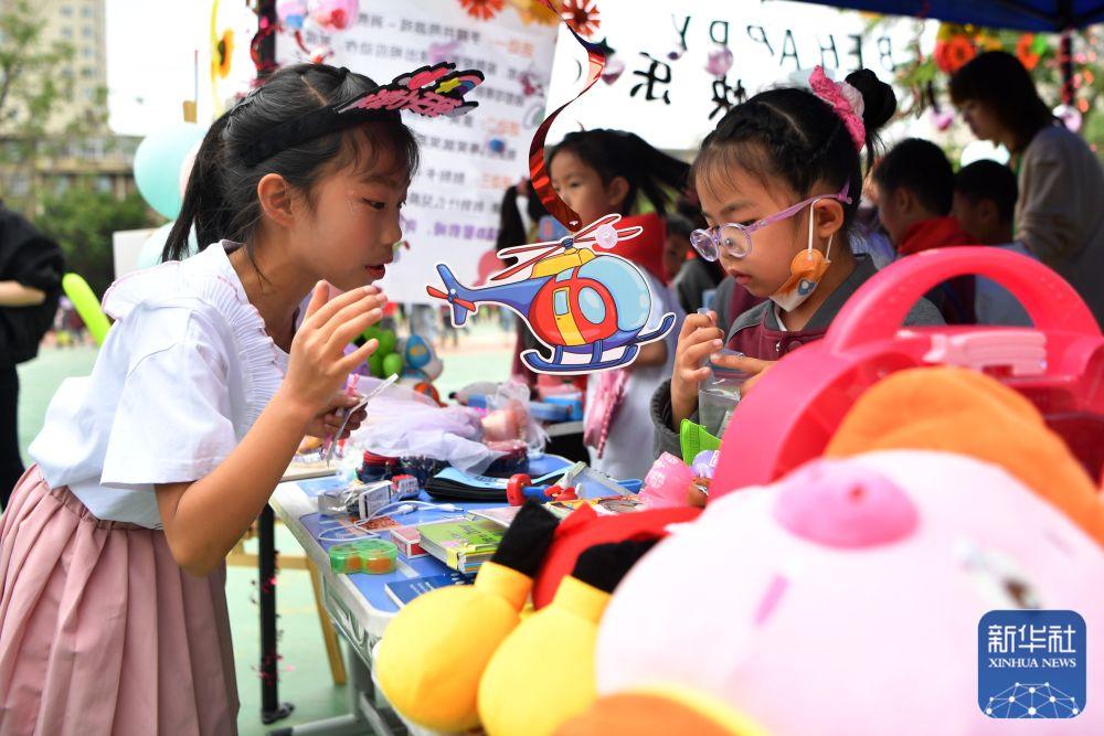 5月31日,兰州市东郊学校的小学生在校园里逛创意义卖市集。新华社记者 陈斌 摄