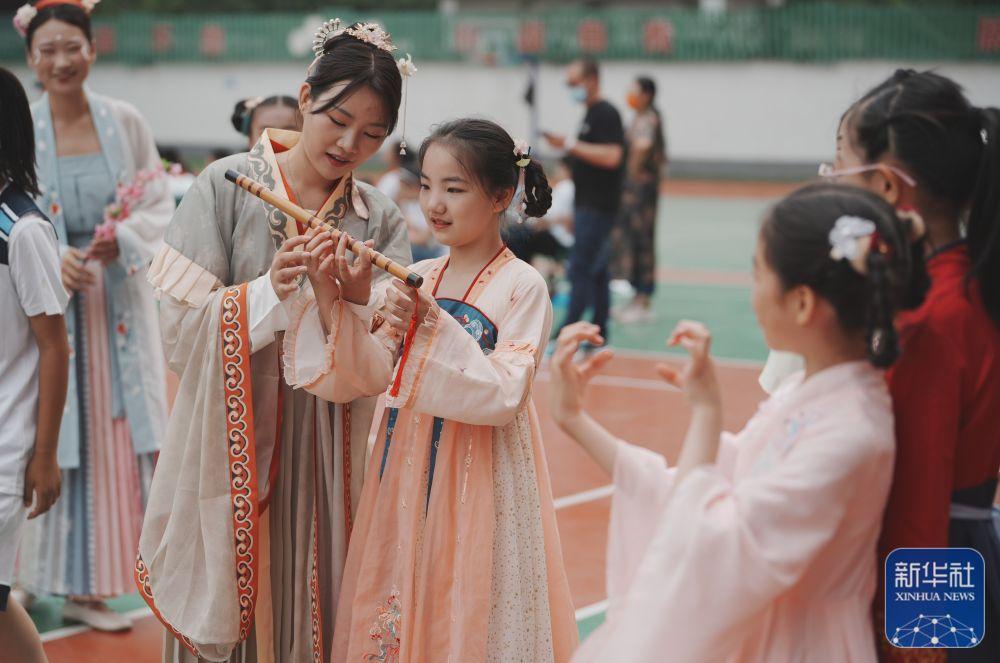 5月31日,在石家庄市新华区东风小学师生着传统服饰参加迎“六一”的活动。新华社发(闫志国摄)