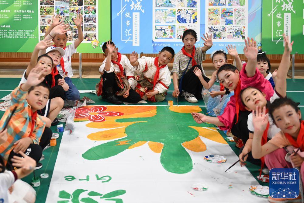 5月31日,青海省玉树藏族自治州玉树市隆宝镇中心寄宿制学校与杭州市萧山区湘师实验小学教育集团(南城校区)的学生一同参与巨画绘制。新华社记者 黄宗治 摄