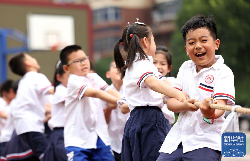 5月31日,在合肥市和平小学第四小学举办的“传统游戏迎六一”活动中,孩子们参加拔河比赛。新华社发(解琛摄)