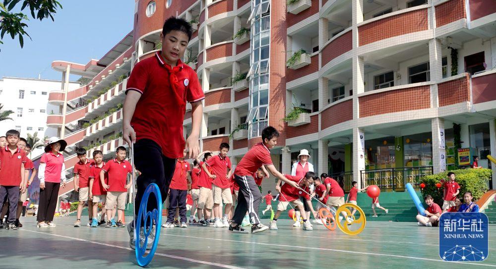 5月31日,广西河池市金城江区第四小学学生在校园参加“滚铁环”趣味游戏。新华社发(高东风摄)