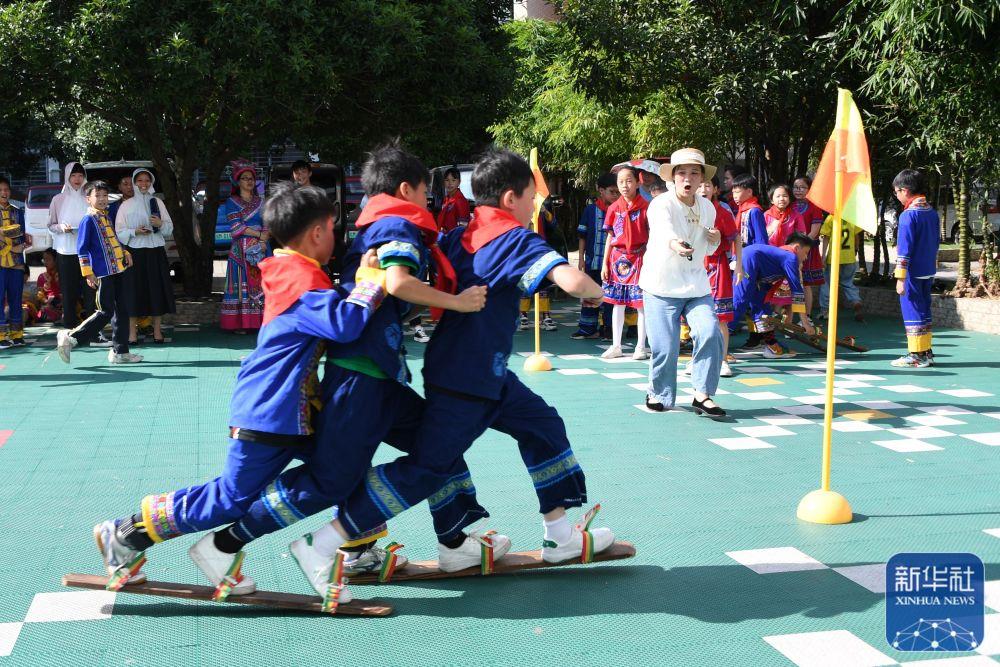 5月30日,在广西罗城仫佬族自治县第二小学,学生参加板鞋接力比赛。新华社发(韦如代摄)
