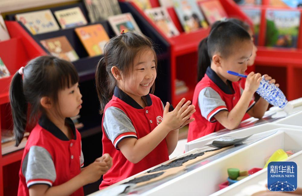 5月31日,在天津市和平区第五幼儿园,小朋友体验手工制作。新华社记者 赵子硕 摄