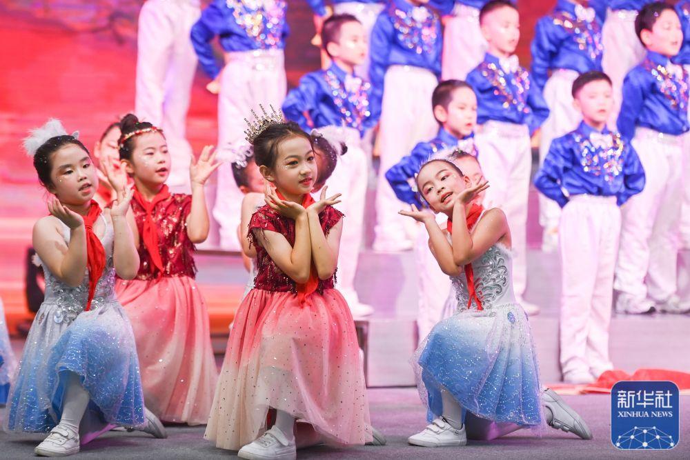 5月31日,杭州市萧山区湘师实验小学教育集团(南城校区)的学生表演合唱节目《我和我的祖国》。新华社记者 黄宗治 摄