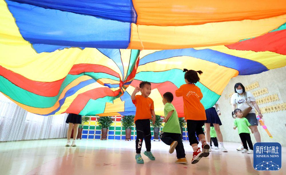 5月31日,在石家庄市长安区第一幼儿园,孩子们进行“遇见彩虹”亲子游戏。新华社记者 骆学峰 摄