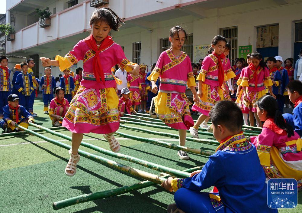5月31日,在石家庄市长安区第一幼儿园,孩子们进行“快乐竹竿舞”游戏。新华社记者 骆学峰 摄