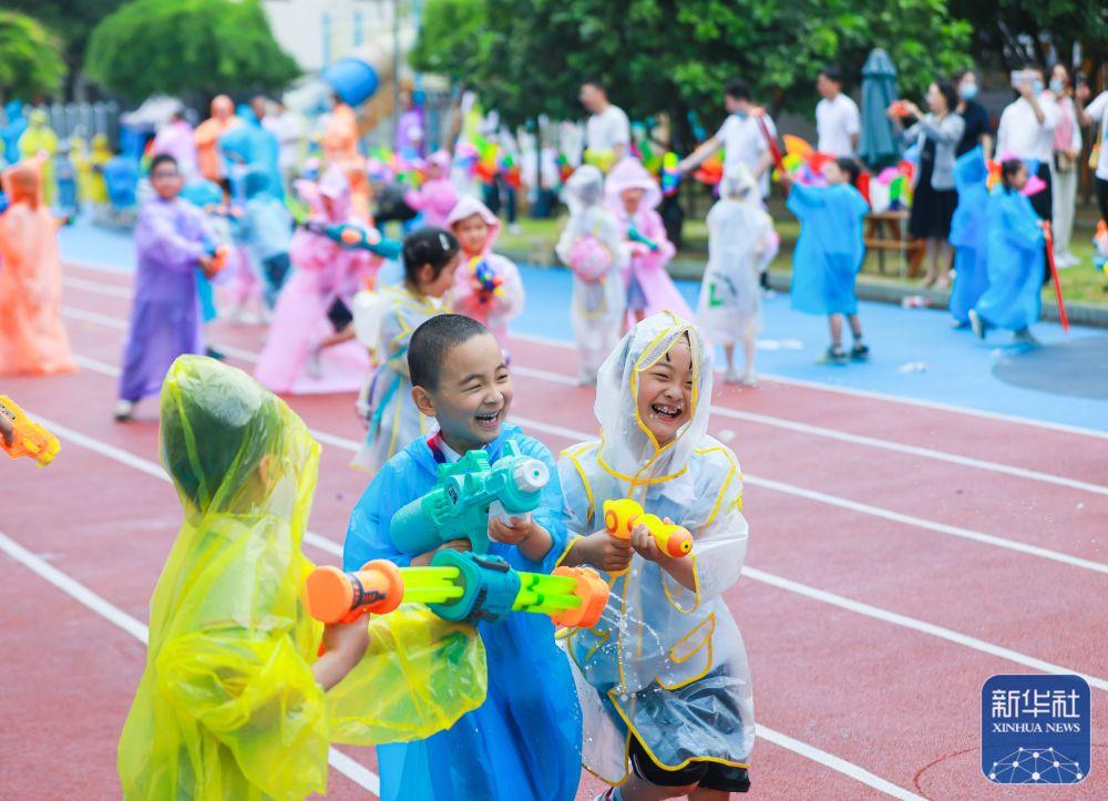 5月31日,在浙江省舟山市定海区机关幼儿园,孩子们玩起水枪大战。新华社发(张磊 摄)