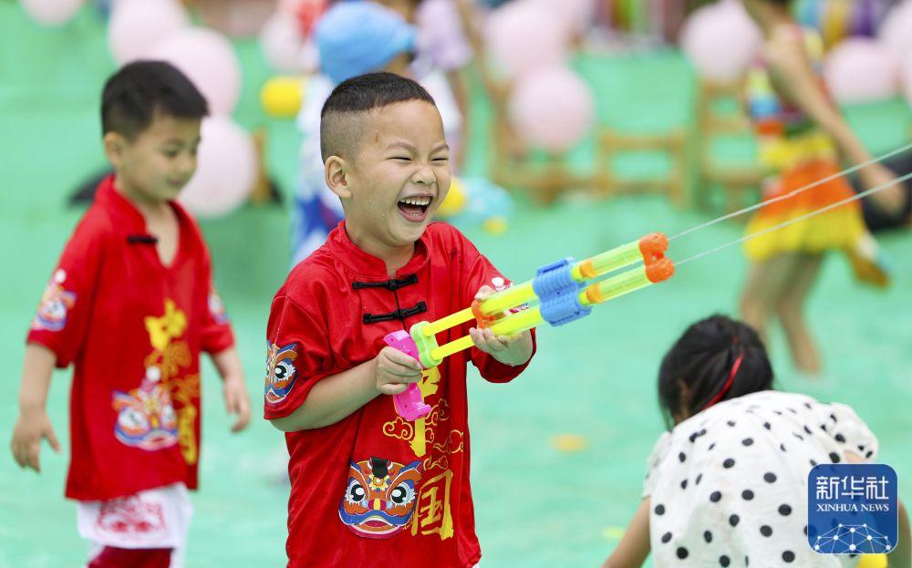 5月31日,贵州省铜仁市玉屏侗族自治县第三幼儿园的小朋友在玩水枪。新华社发(胡攀学摄)