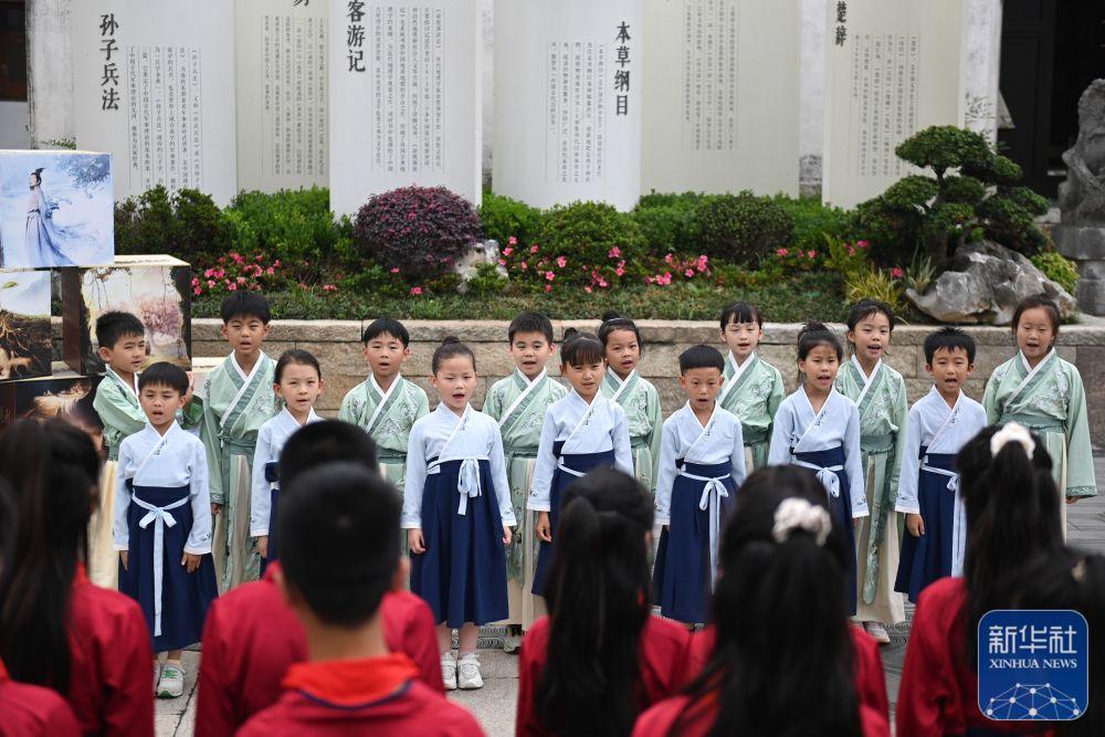 5月31日,在浙江省湖州市吴兴区八里店镇潞村“典籍里的中国”陈列馆门口,参加“诵读国学经典 传承华夏气韵”主题活动的小学生集体诵读国学篇目。新华社记者 黄宗治 摄