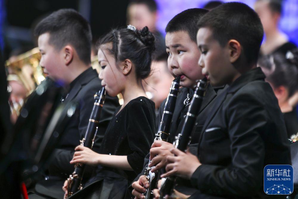 5月30日晚,新疆乌鲁木齐市第三十八小学“枫灵乐团”的学生在音乐会上演奏。新华社记者 王菲 摄