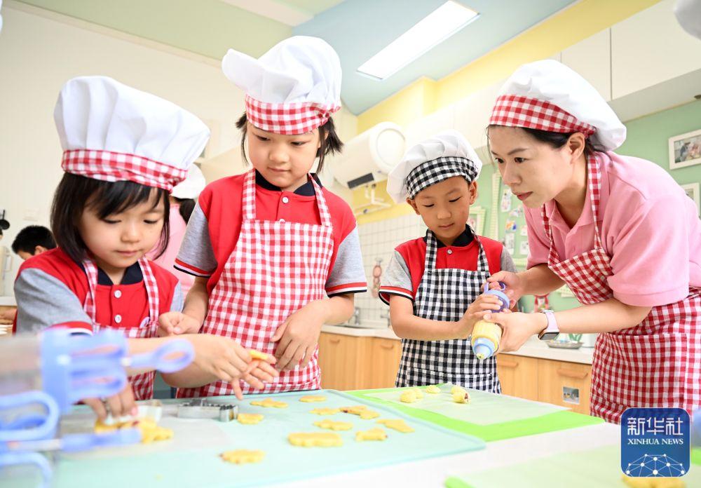 5月31日,在天津市和平区第五幼儿园,小朋友在劳动教育系列活动上体验面点制作。新华社记者 赵子硕 摄