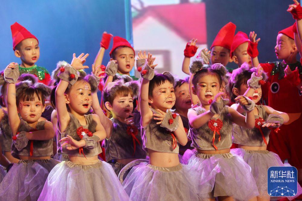 5月31日,在石家庄第二外国语学校附属幼儿园,孩子们在迎“六一”演出活动中表演节目。新华社记者 骆学峰 摄