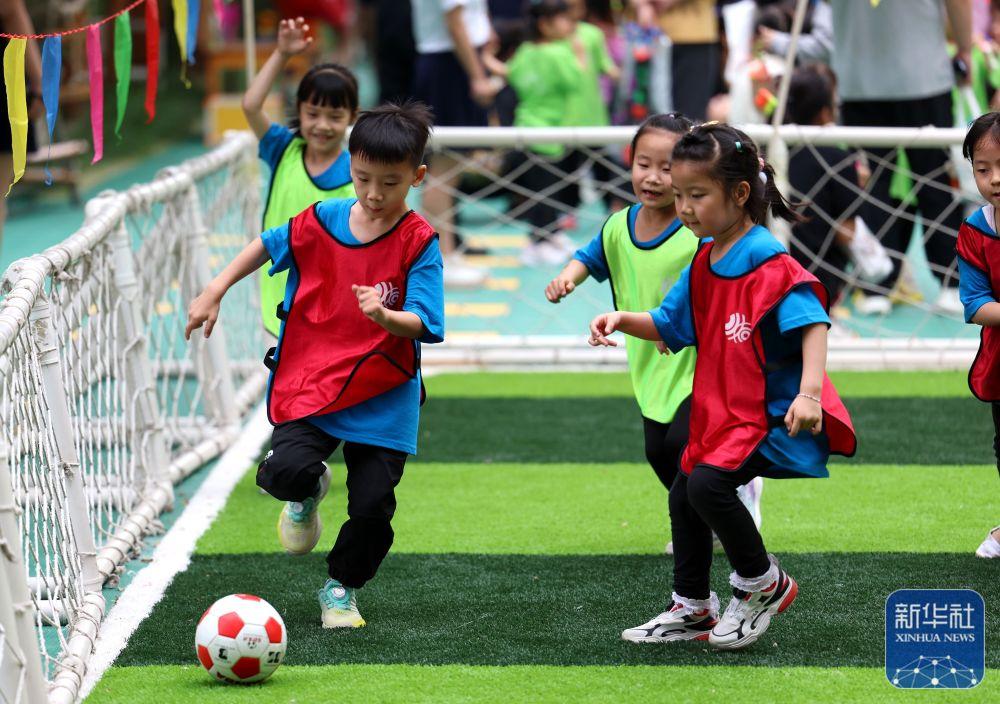 5月31日,在石家庄市长安区第一幼儿园,孩子们进行快乐足球游戏。新华社记者 骆学峰 摄